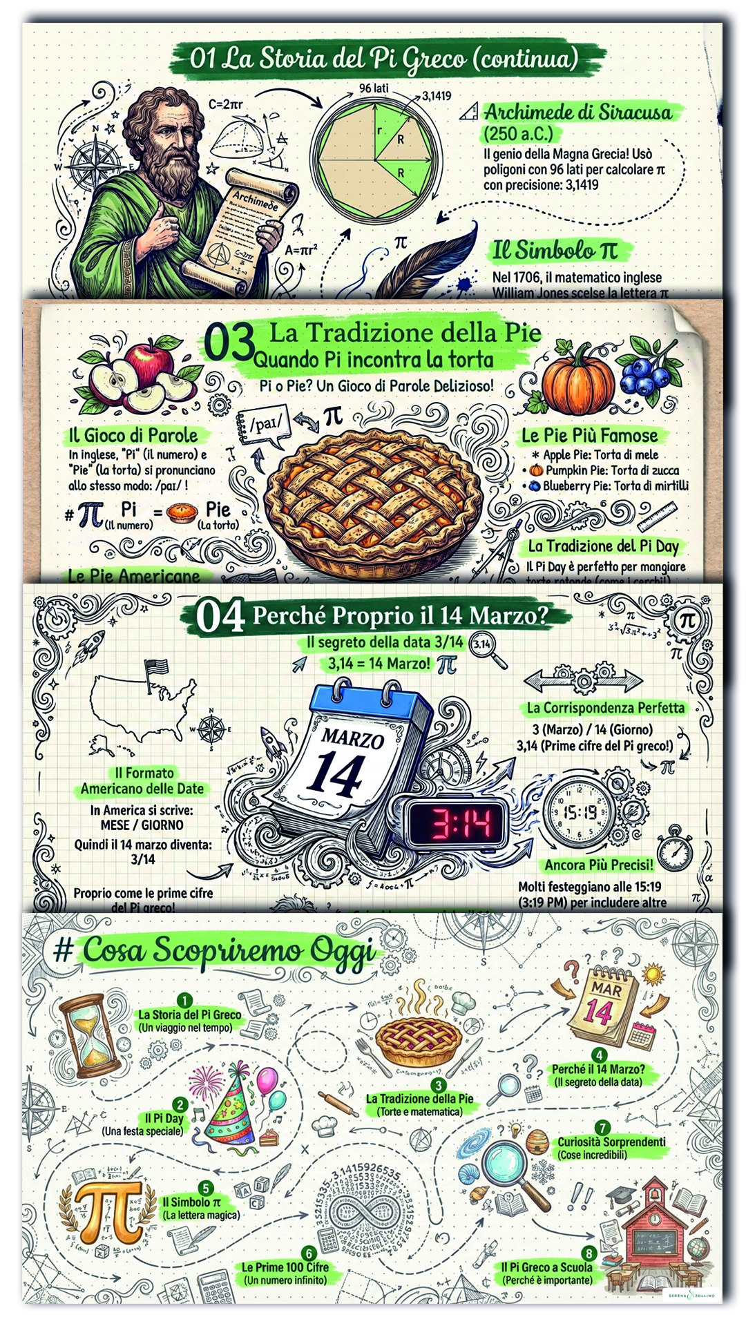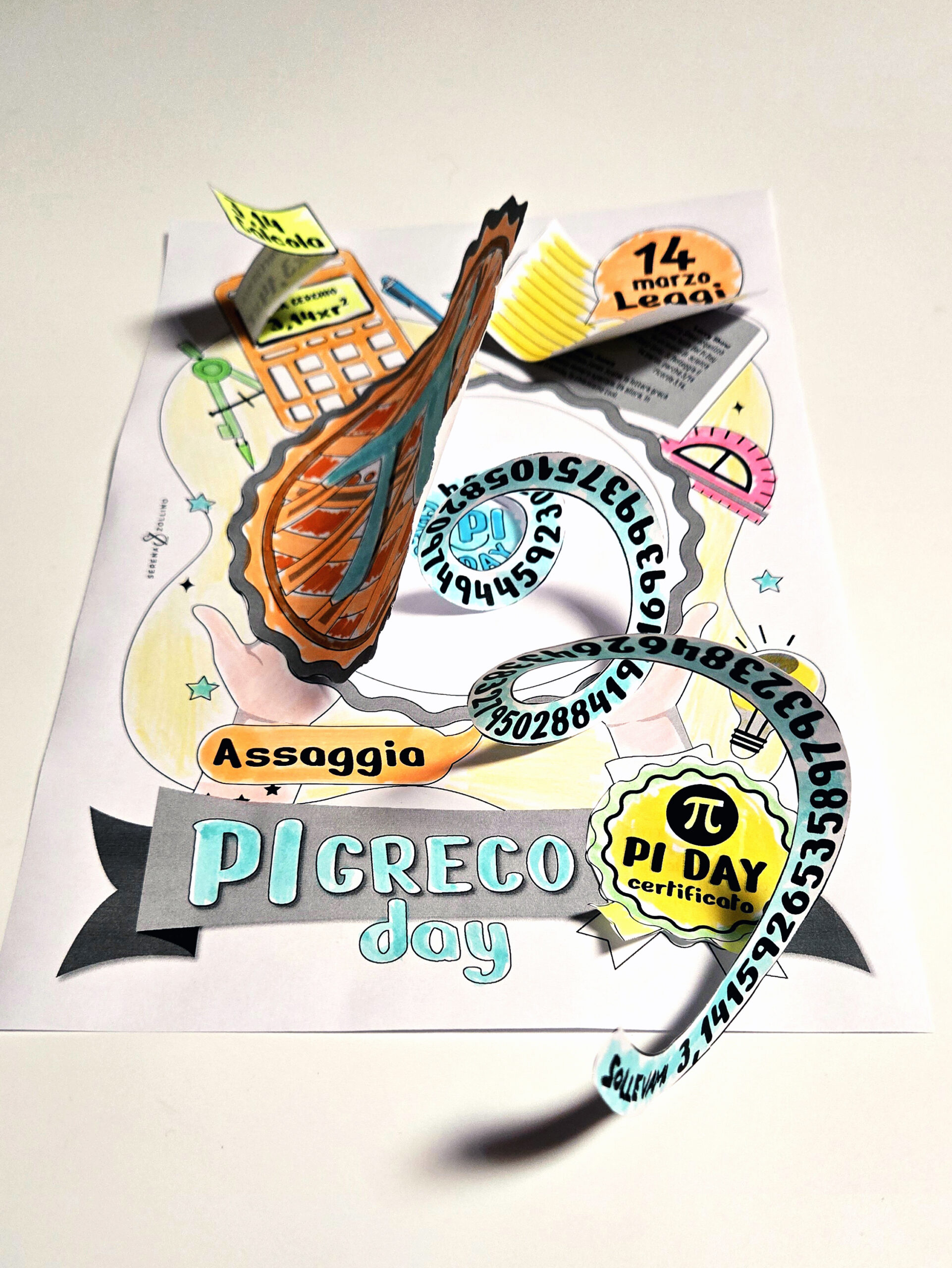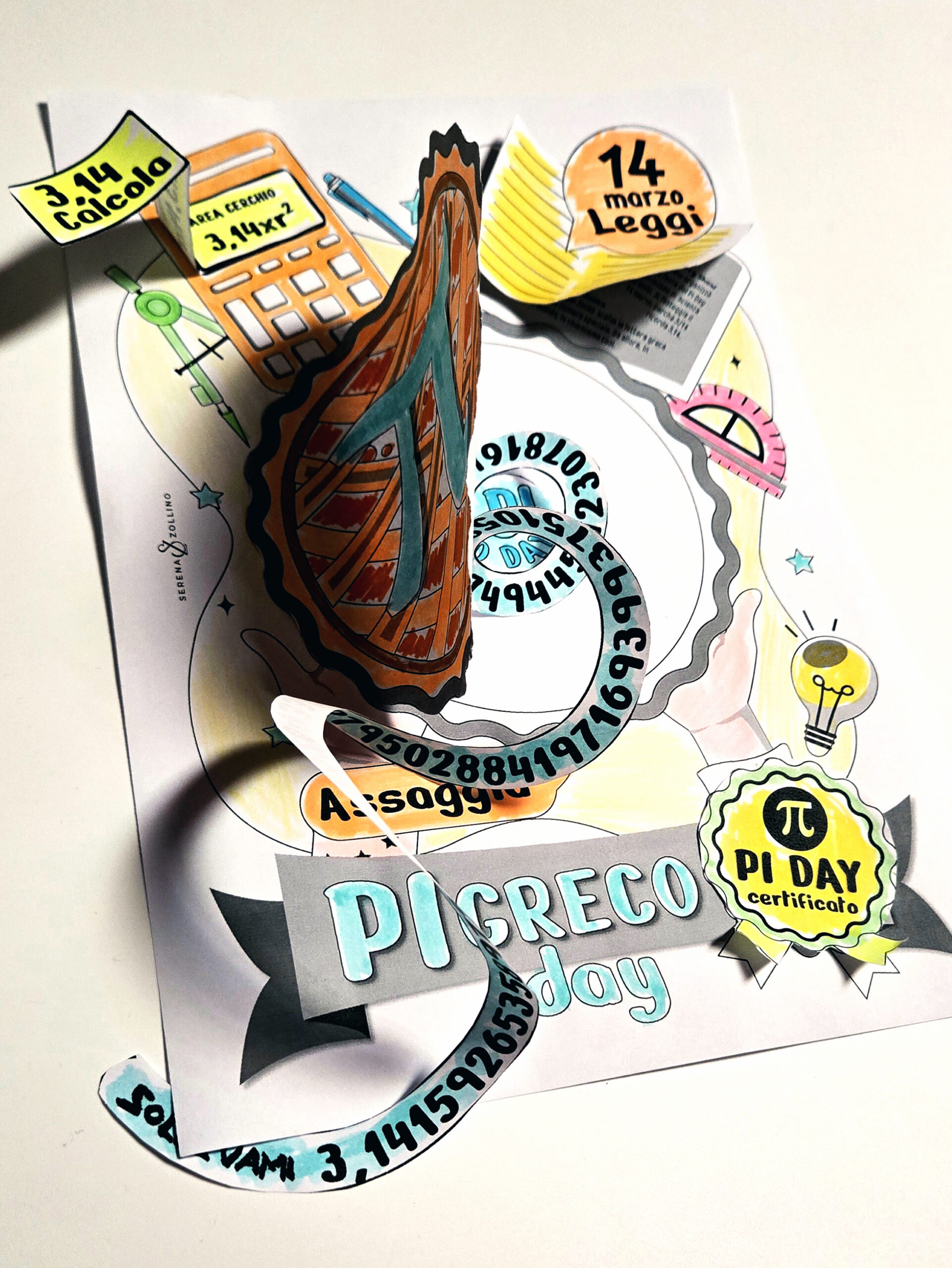 Ci sono concetti matematici che arrivano in classe già pronti sotto forma di formula. Il π greco è uno di questi: 3,14… un numero affascinante ma spesso presentato ai bambini solo come qualcosa da usare nei calcoli. Quando succede, il rischio è che resti un simbolo da ricordare, più che un’idea da capire. Questa risorsa nasce proprio per ribaltare l’ordine: prima il significato, poi la formula. L’attività trasforma il Pi Day (14 marzo) in un momento di scoperta guidata in cui storia della matematica, curiosità, manipolazione e calcolo si intrecciano in un unico percorso. La prima parte della proposta è il PITCH. Con questo nome mi riferisco alla presentazione in slide da proiettare alla classe, pensata per accompagnare l’insegnante nella spiegazione e coinvolgere gli alunni nella scoperta del numero π attraverso immagini, curiosità e brevi racconti: • che cos’è il numero π • perché è legato al cerchio • il significato di 3,14 • alcune curiosità storiche legate alla scoperta del π • il collegamento con il Pi Day del 14 marzo Il pitch crea il contesto di senso necessario per rendere l’attività successiva maggiormente significativa, la SCHEDA OPERATIVA IN 3D con costruzione manipolativa. La scheda comprende: • Elementi da ritagliare e assemblare per creare una struttura tridimensionale dedicata al π • Sezione “Leggi” con 3 brevi curiosità su – Archimede – William Jones – Larry Shaw, ideatore del Pi Day • Sezione “Calcola 3,14” con le formule per – circonferenza – area del cerchio • Spirale centrale da incollare e sollevare con le prime 100 cifre dopo la virgola • Illustrazione a forma di torta che richiama la tradizione del Pi Day • Certificato Pi Day che l’insegnante consegna agli alunni al termine dell’attività • Istruzioni visive di piegatura e incollaggio per facilitare il montaggio. Come utilizzare la risorsa in classe? L’insegnante avvia la lezione con il Pitch proiettato, introducendo il numero π e le sue curiosità. Gli alunni esplorano le brevi letture presenti nella scheda. Si passa ad un approfondimento sui calcoli legati al cerchio. Gli alunni ritagliano e assemblano gli elementi creando il loro elaborato tridimensionale. A completamento del lavoro ricevono il certificato Pi Day. In questo modo il π non resta una formula isolata, ma diventa un’esperienza che si ascolta, si scopre e si costruisce. Buone scoperte in classe e buon 3,1415926535897932384626433832795028841971693993751058209749445923078164!