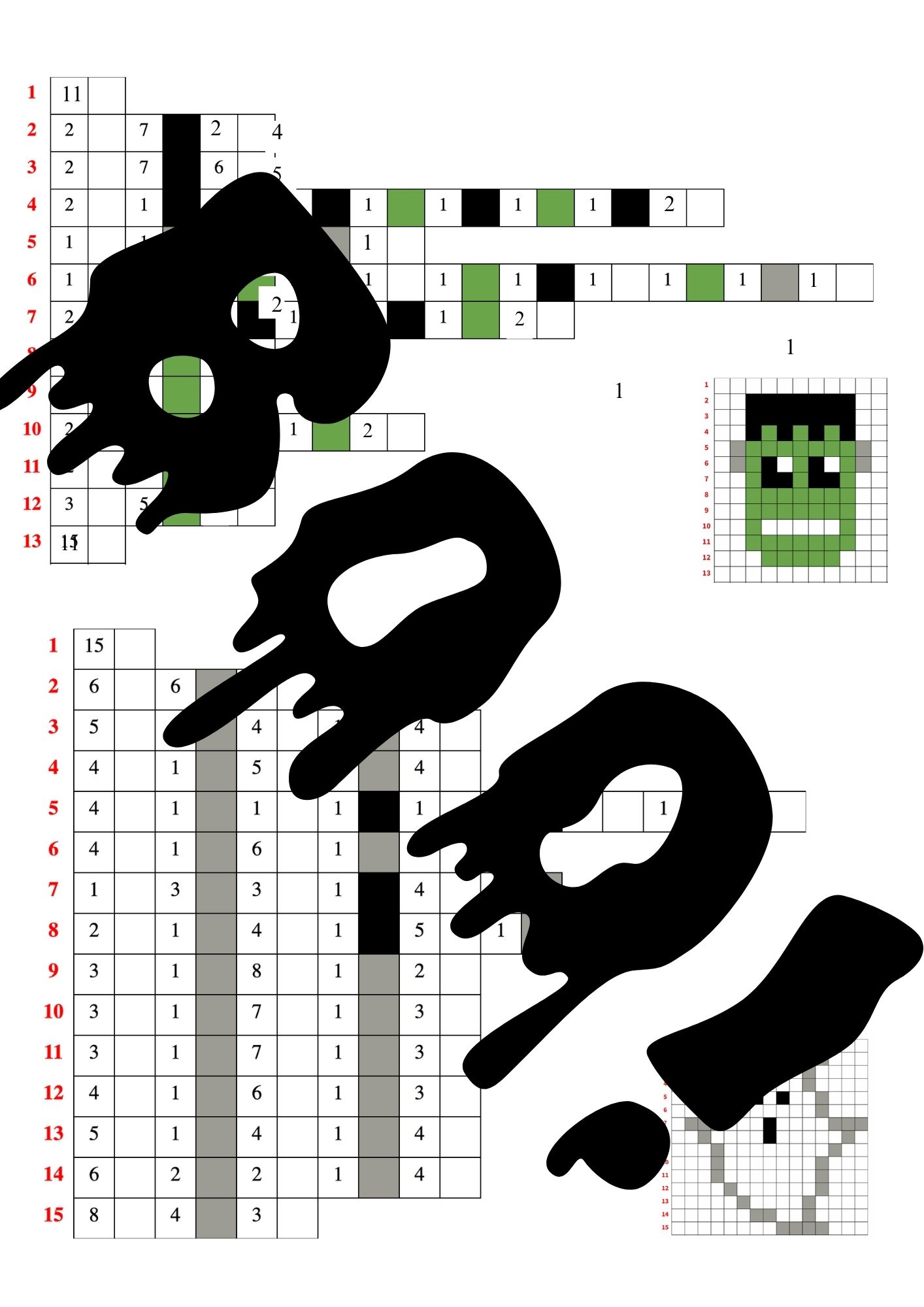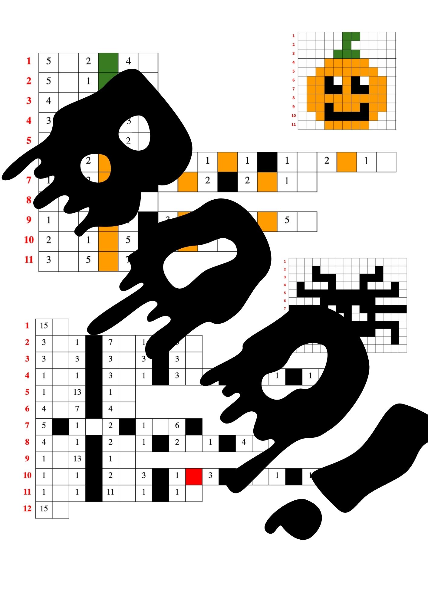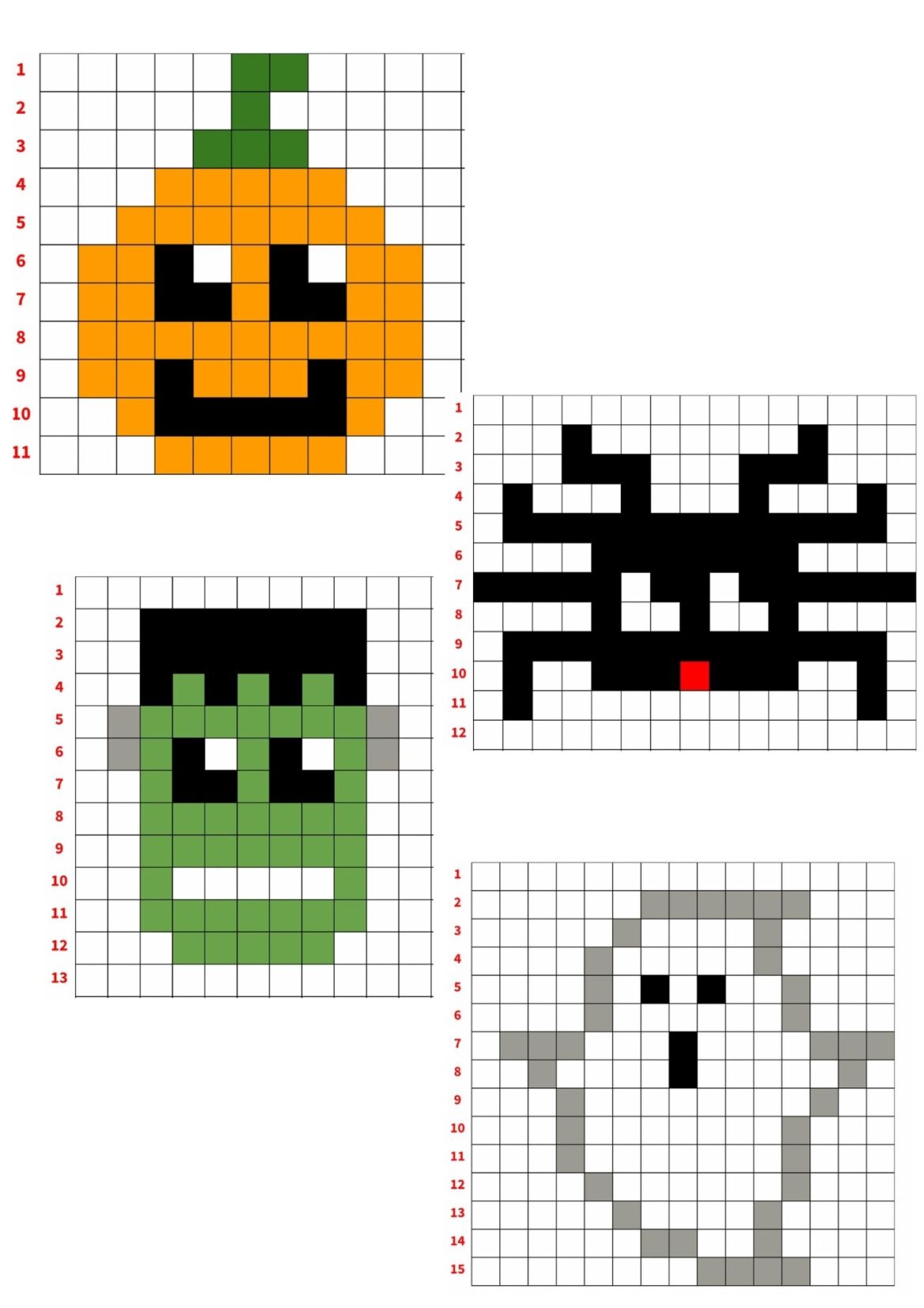 • Ogni scheda propone un codice di pixel art: i bambini creano sul quaderno o su un foglio una griglia numerata e, decifrando il codice, colorano i quadratini della propria griglia in base al numero indicato e realizzano un disegno a tema Halloween!