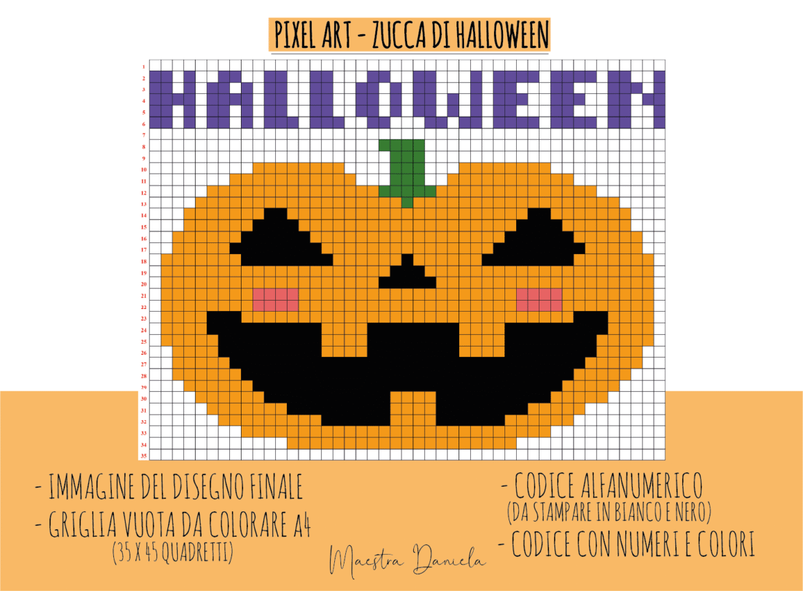 🎃Un’attività di Pixel Art a tema Halloween perfetta per divertirsi con i bambini esercitando logica, attenzione e coordinazione! Seguendo la griglia e i codici colore, comparirà una simpatica zucca di Halloween.