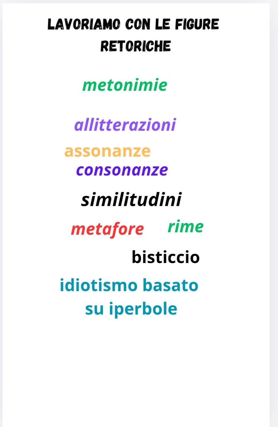 LE FIGURE RETORICHE PROPOSTE NEI VARI ESERCIZI SONO DIVERSE: SIMILITUDINI, METAFORE, RIME, ALLITTERAZIONI, METONIMIE, ALLITTERAZIONI, ASSONANZE, BISTICCI IDIOTISMI BASATI SU IPERBOLE.