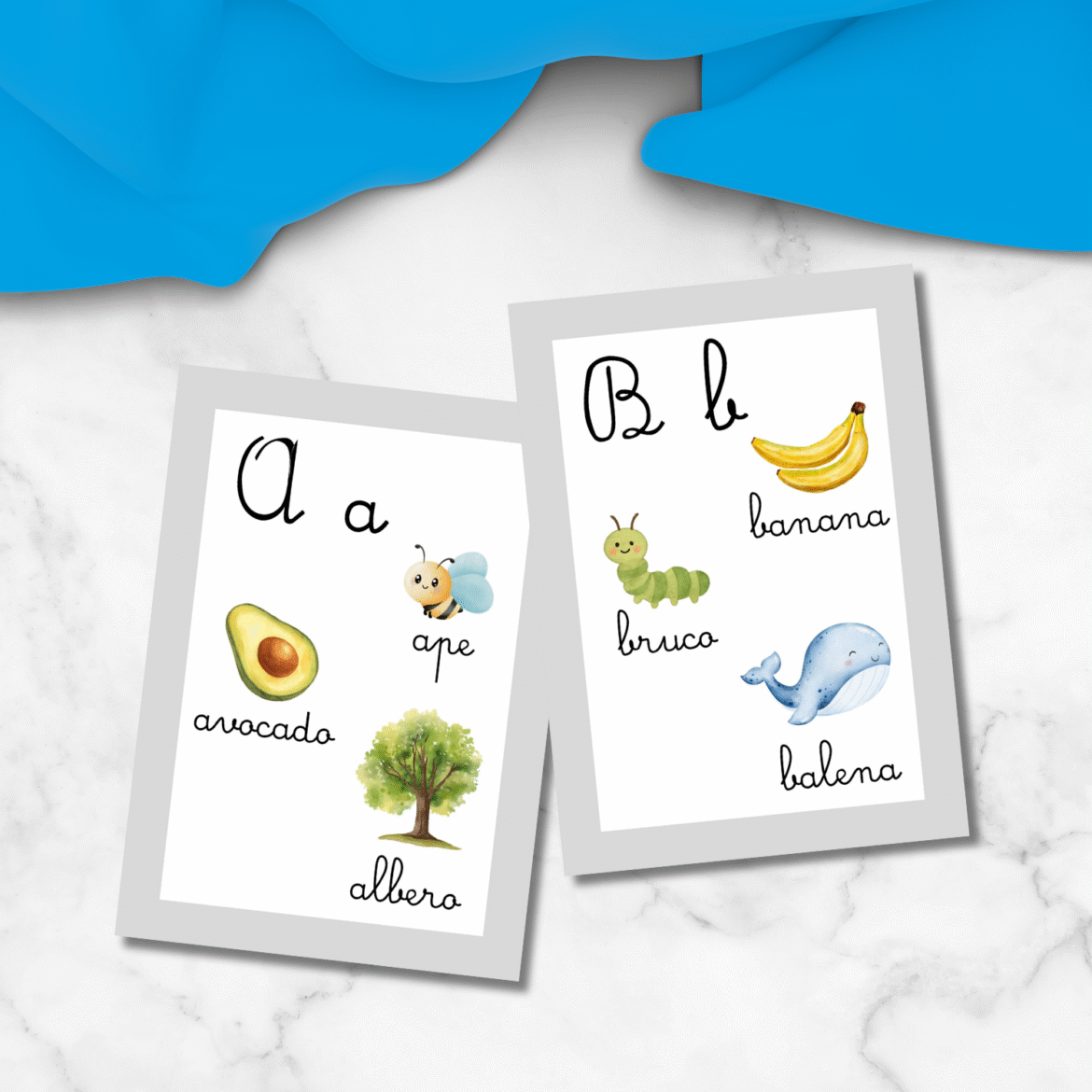 Le illustrazioni dei vari poster sono ad effetto acquerello per rendere questo alfabetiere davvero bello sia da stampare e appendere in classe, sia da stampare e inserire nel quaderno. Volendo dopo aver stampato il PDF potrete rilegarlo con un dorsetto a spirale e creare così il vostro alfabetiere in corsivo personalizzato.