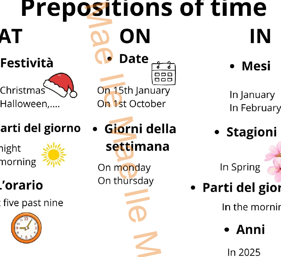 Nel primo foglio è presente una tabella chiara e sintetica che spiega l’uso delle preposizioni di tempo ON, IN e AT, con indicazione di quando si usano ed esempi pratici, seguita da un esercizio di completamento.