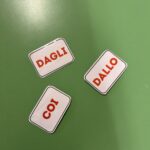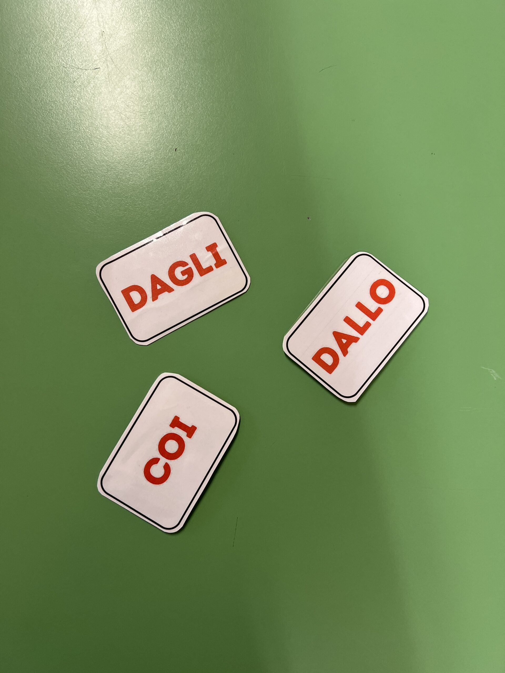 Dopo gli esercizi in piccolo gruppo, siamo passati alle preposizioni articolate grazie a un grande cartellone (70×90 cm) che ho preparato per l’occasione: da un lato le preposizioni, dall’altro gli articoli… e nelle caselle le preposizioni articolate, stampate e plastificate, fissate con il velcro.