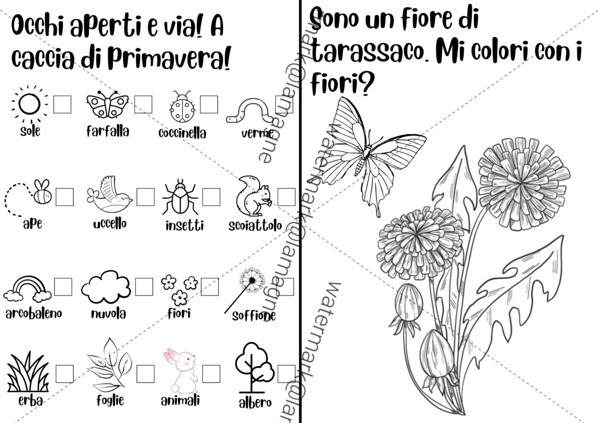 - Una check-list visuale e testuale di elementi naturali tipici (fiori, insetti, animali,ecc) da scovare nel giardino della scuola, nel bosco o al parco;