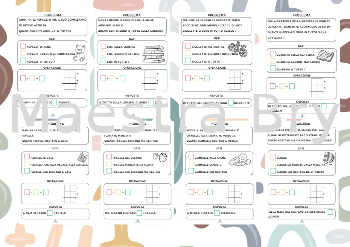 8 semplici problemi guidati con addizioni ( 13+10; 25+12; 15+11; 12+10 ) e sottrazioni ( 25-12; 18-8; 37-15; 26-14)