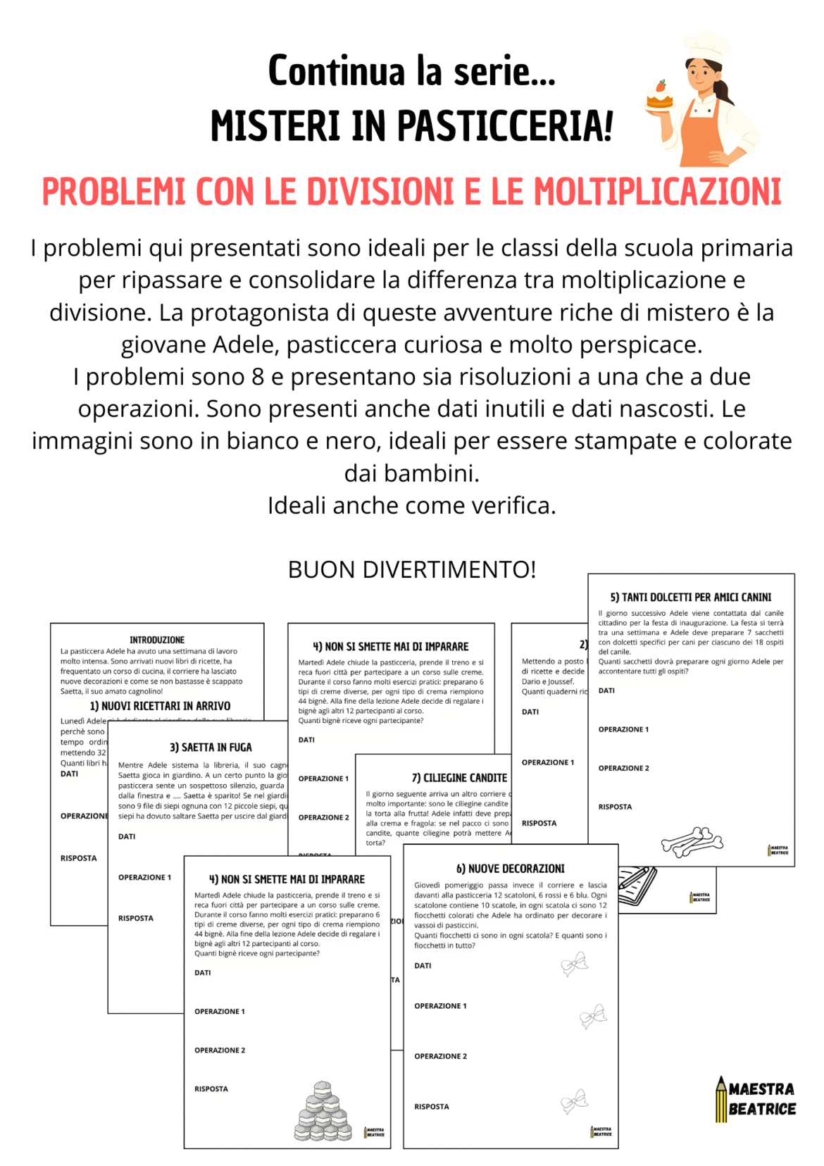 I problemi qui proposti sono ideali per le classi della scuola primaria per ripassare e consolidare la differenza tra moltiplicazione e divisione. La protagonista di queste avventure ricche di mistero è la giovane Adele, pasticcera curiosa e molto perspicace.