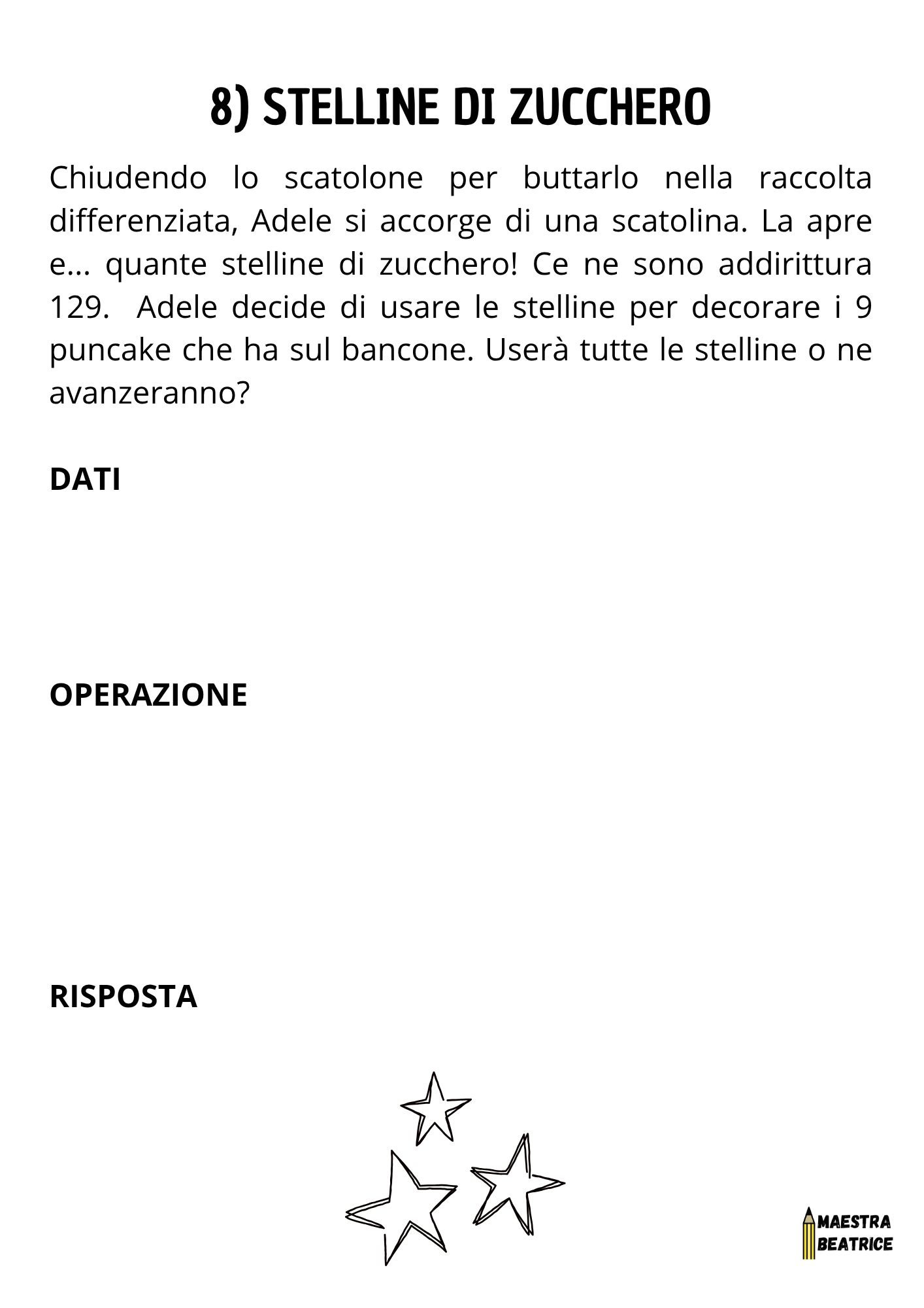I problemi sono 8 e presentano sia risoluzioni a una che a due operazioni. Sono presenti anche dati inutili e dati nascosti oltre a uno schema risolutivo: