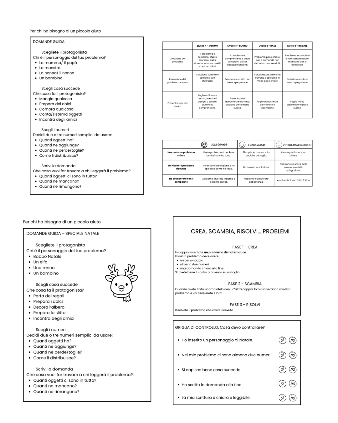 - Supporto alla creazione: Il materiale include schede con domande guida dettagliate per aiutare a scegliere personaggi, azioni, numeri e formulare la domanda, rendendo la creazione del problema accessibile a tutti.
