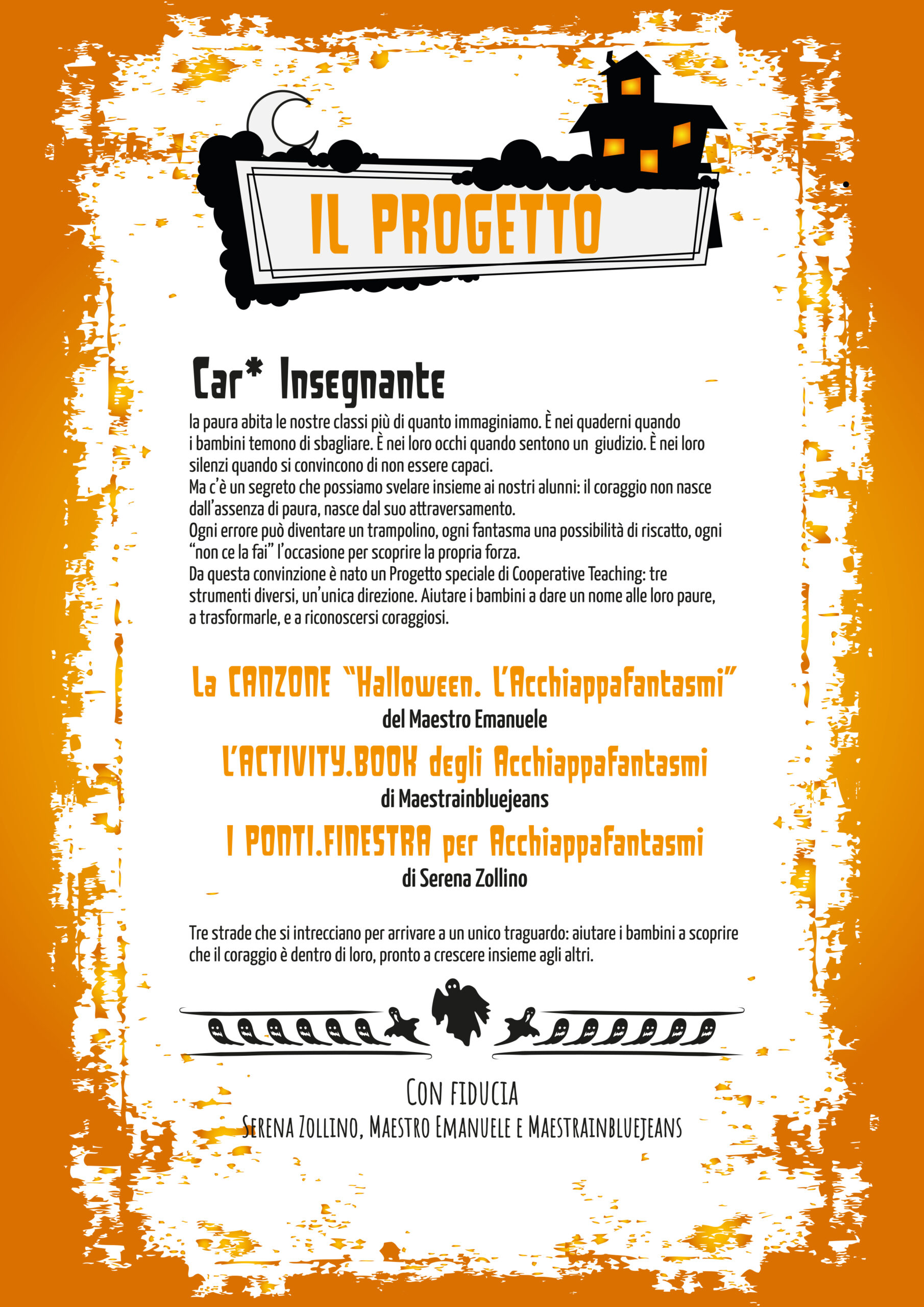 Noi crediamo che la scuola debba dare spazio a questa paura, senza giudicarla o nasconderla, ma trasformandola in occasione. È da questa convinzione che nasce “L’Acchiappafantasmi”, un Progetto di Cooperative Teaching firmato da Maestro Emanuele, Maestrainbluejeans e Serena Zollino.