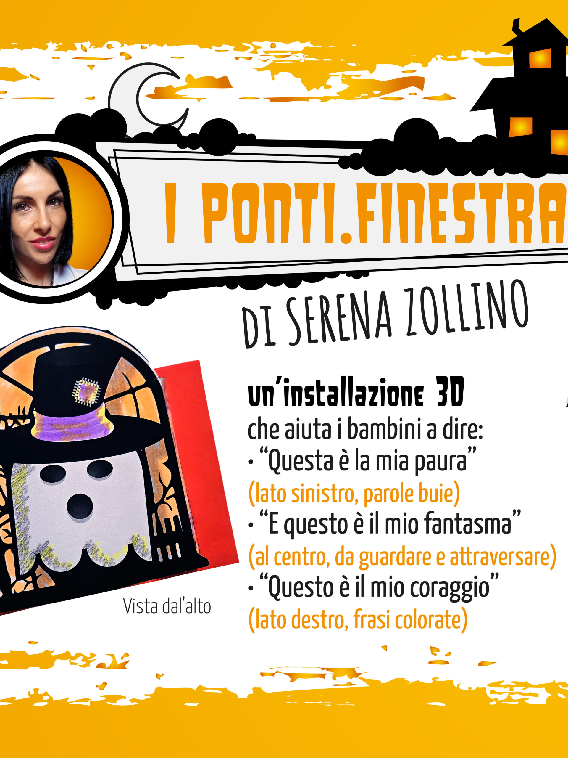 🌉🪟 I Ponti-Finestra 3D di Serena Zollino: un laboratorio creativo in 3D, che porta in classe un’installazione collettiva, dove ogni bambino mette in scena il viaggio dalla paura al coraggio: fantasmi che spuntano dalle finestre, case che fanno da sfondo, ponti che collegano il buio e il colore, parole buie e colorate tratte dalla canzone.