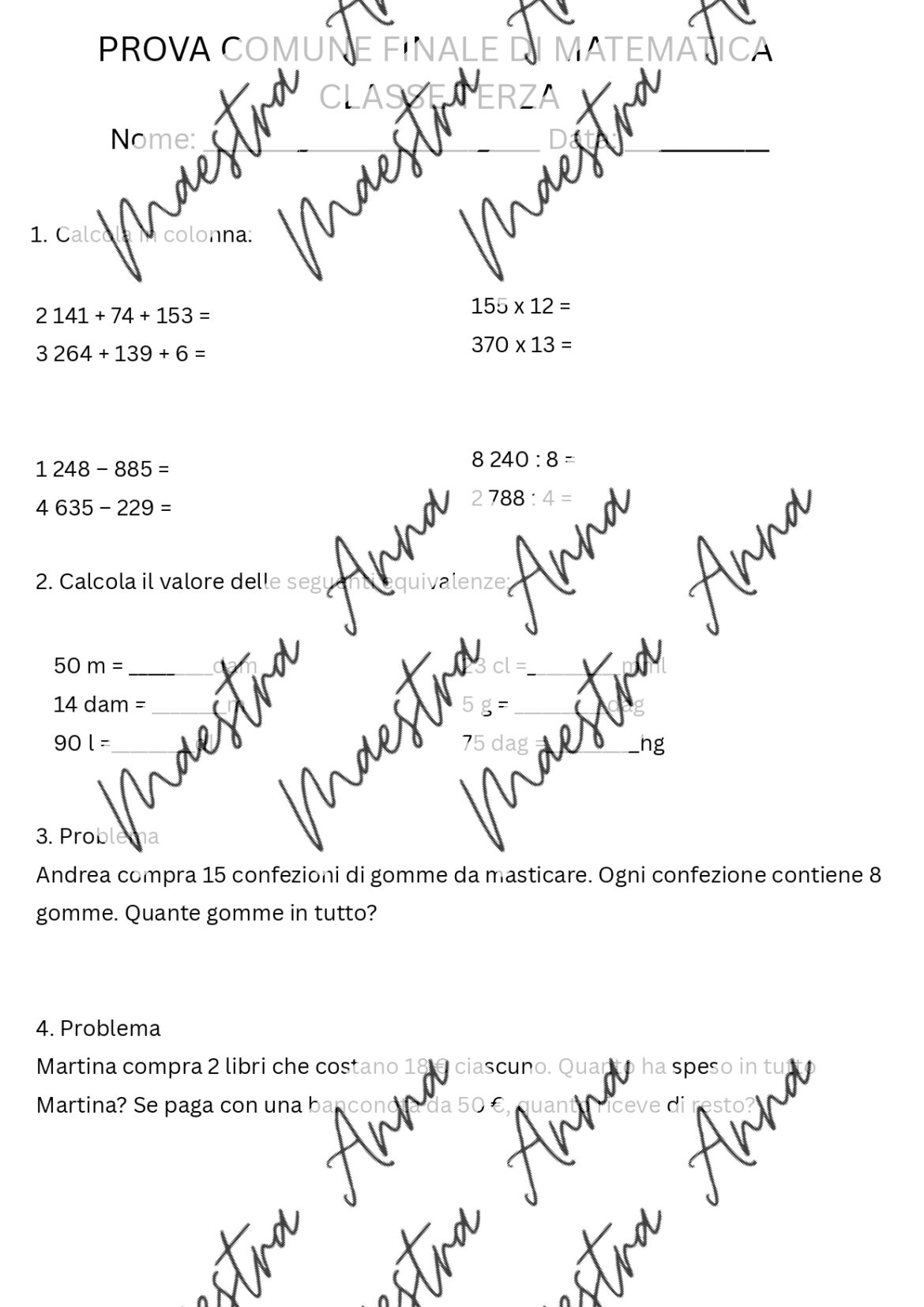 Questa prova comune finale di matematica è pensata per gli alunni di classe terza primaria e consente di verificare in modo completo e strutturato le competenze acquisite durante l’anno scolastico.
