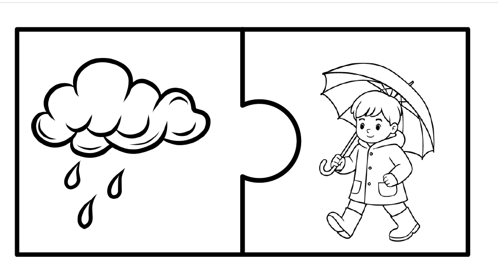 Ad esempio, il bambino associa il disegno della pioggia con quello dell’ombrello, comprendendo il legame logico tra i due elementi. Dopo aver completato il puzzle, il bambino è invitato a completare semplici frasi, rinforzando il linguaggio e la comprensione del significato.
