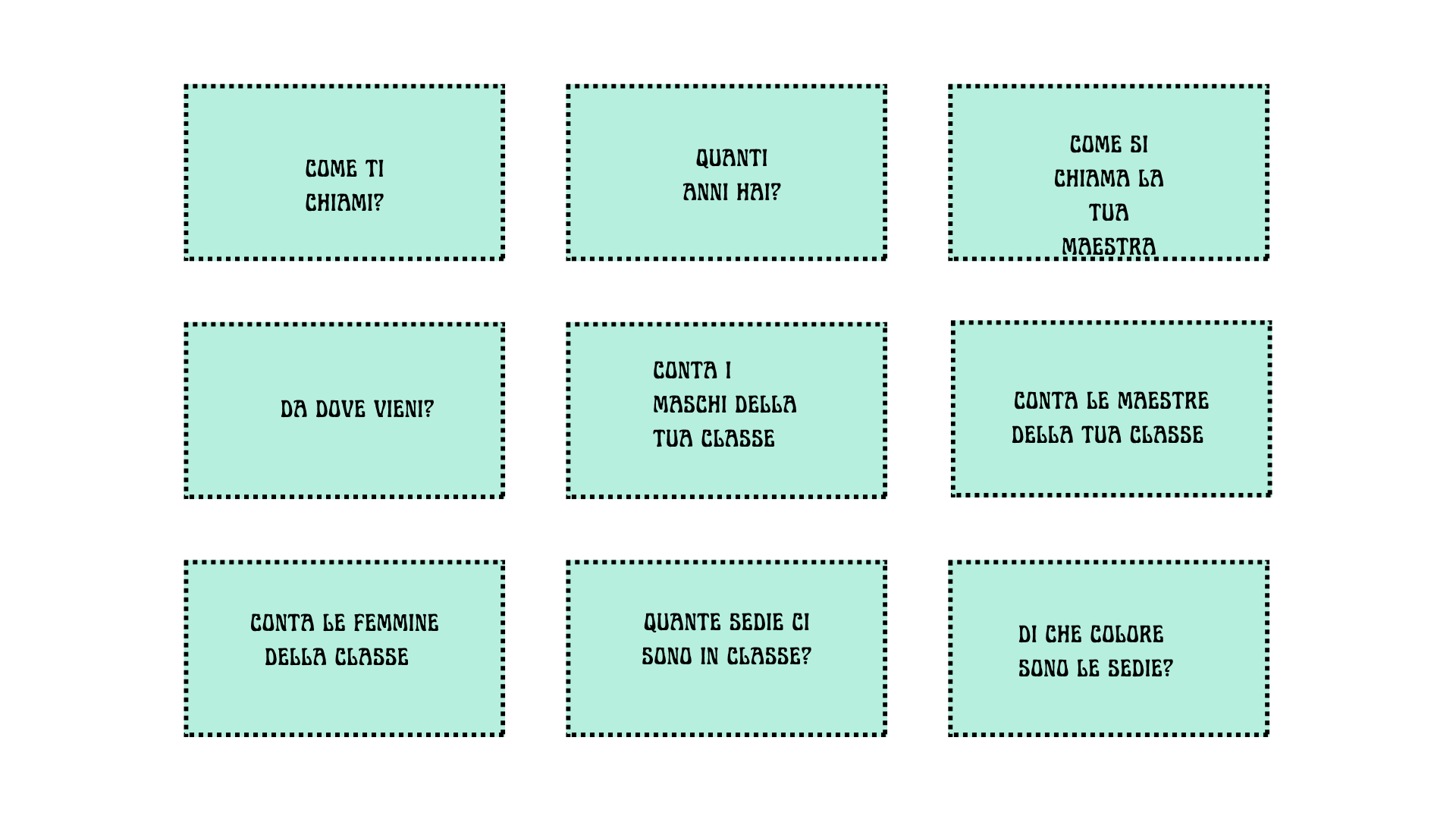 - Capacità di presentarsi e rispondere a domande personali (nome, età, nazionalità).