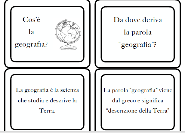 Le flash card hanno la domanda da un lato e la risposta sul retro: vanno ritagliate e incollate le due facciate.