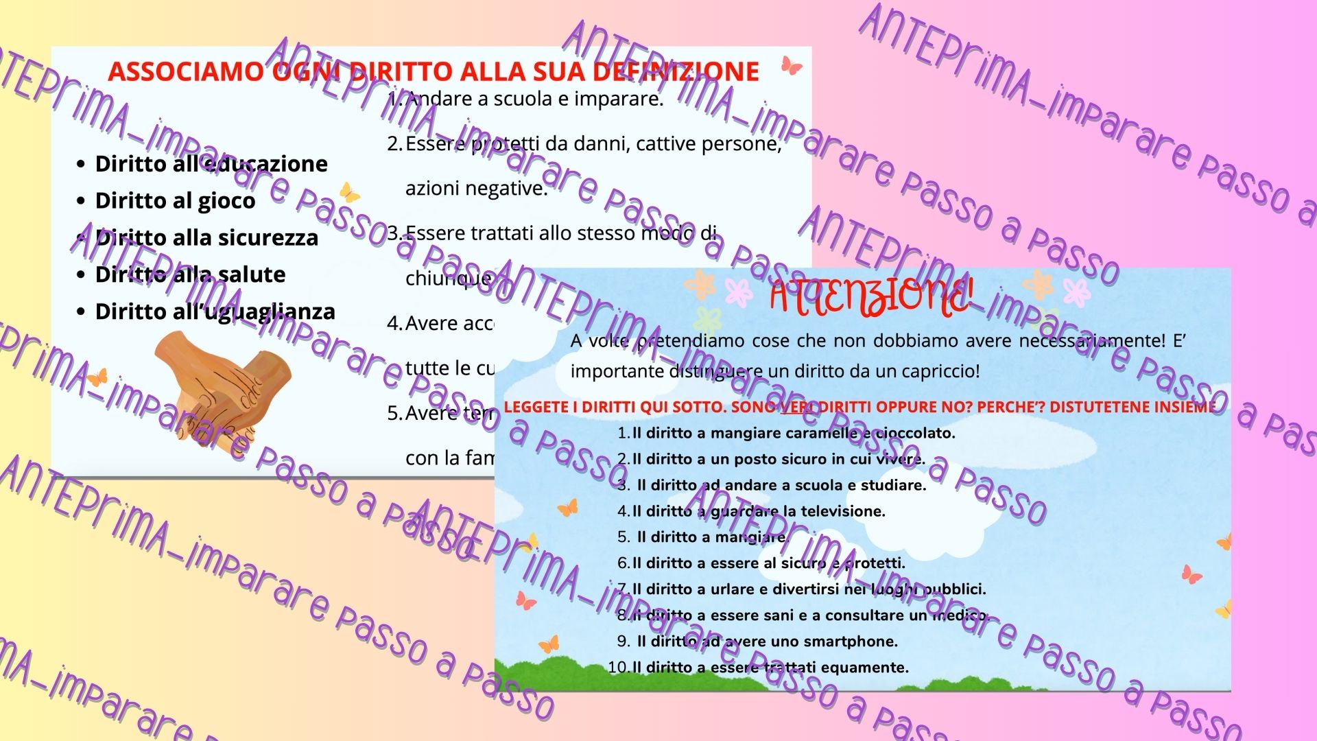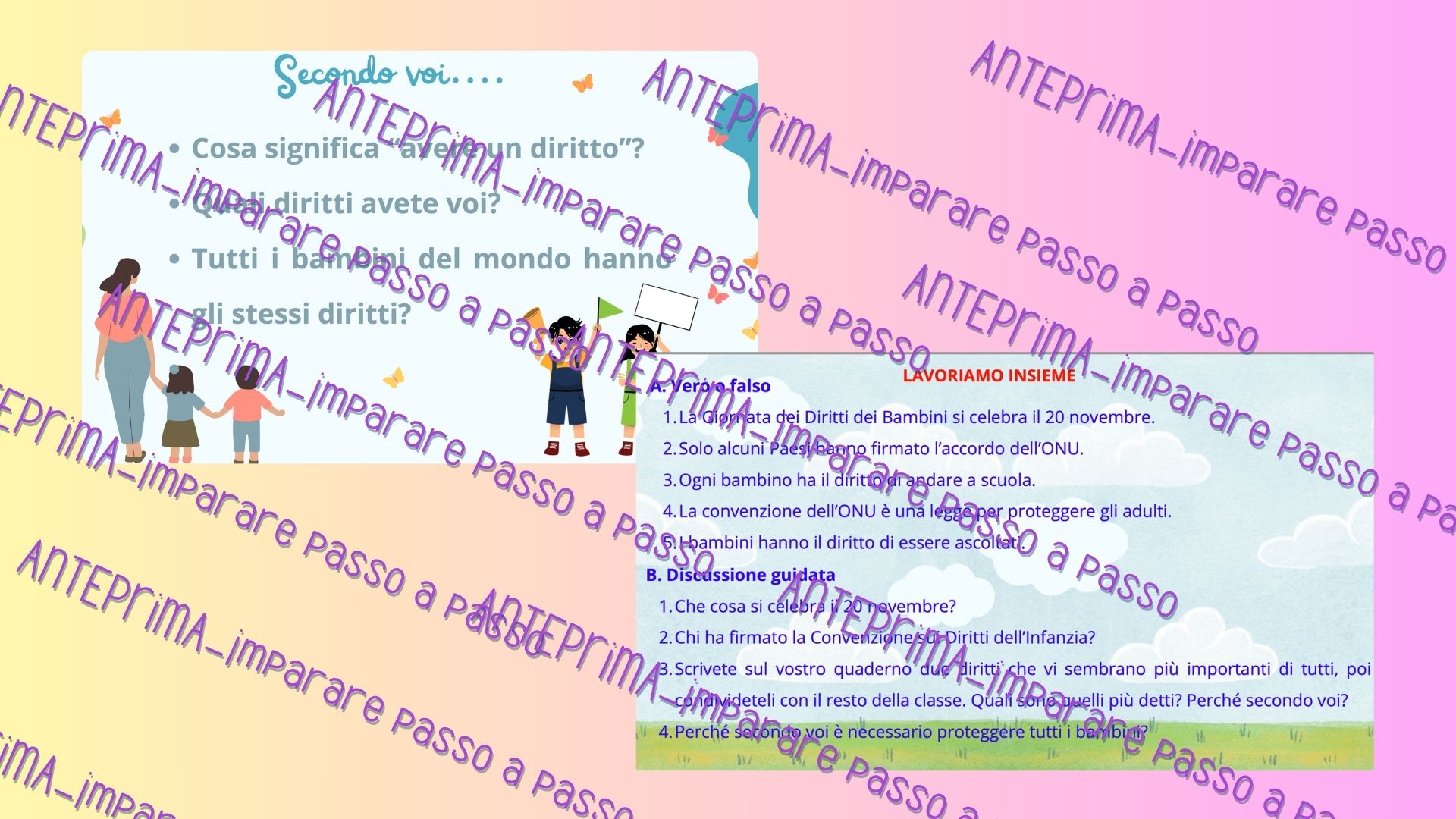 Riflessione guidata su Giornata internazionale dei diritti dei bambini e degli adolescenti 👧👦💙 Questo materiale aiuta gli alunni a conoscere i loro diritti fondamentali, sviluppare consapevolezza, riflessione critica e partecipare ad attività cooperative e creative. ✨ Cosa contiene il PDF? 📌 1. Introduzione ai diritti dei bambini Domande-stimolo per attivare la riflessione e l’interesse Testo semplice e accessibile con spiegazione della Convenzione ONU 🧩 2. Attività di comprensione Vero/Falso Domande di discussione guidata 🎯 3. Associazione diritto–definizione Perfetto per lavorare sul lessico e sulle competenze cognitive. 🔍 4. Riflessione: diritto o capriccio? Un’attività che aiuta i bambini a distinguere bisogni reali e desideri superficiali.🧠💬 💬 5. Piccola discussione finale 🎓 Obiettivi didattici ✔ Conoscere i principali diritti riconosciuti dall’ONU ✔ Ampliare il vocabolario collegato a diritti, scuola, famiglia e salute ✔ Sviluppare riflessione personale e pensiero critico ✔ Realizzare un prodotto creativo finale (a discrezione dell’insegnante: poster, lapbook, cartellone, diario visivo…) 🎨🖍️ 🧑‍🏫 A chi è rivolto: Scuola primaria (tutte le classi) Attività di classe, gruppi, cooperative learning Laboratori sulla cittadinanza attiva 💡 Modalità consigliata di utilizzo 📲 1. Proiezione alla LIM Il PDF è pensato per essere proiettato direttamente in classe: Testo chiaro e leggibile Impaginazione pulita Attività facilmente compilabili insieme Ottimo per discussione guidata e cooperative learning