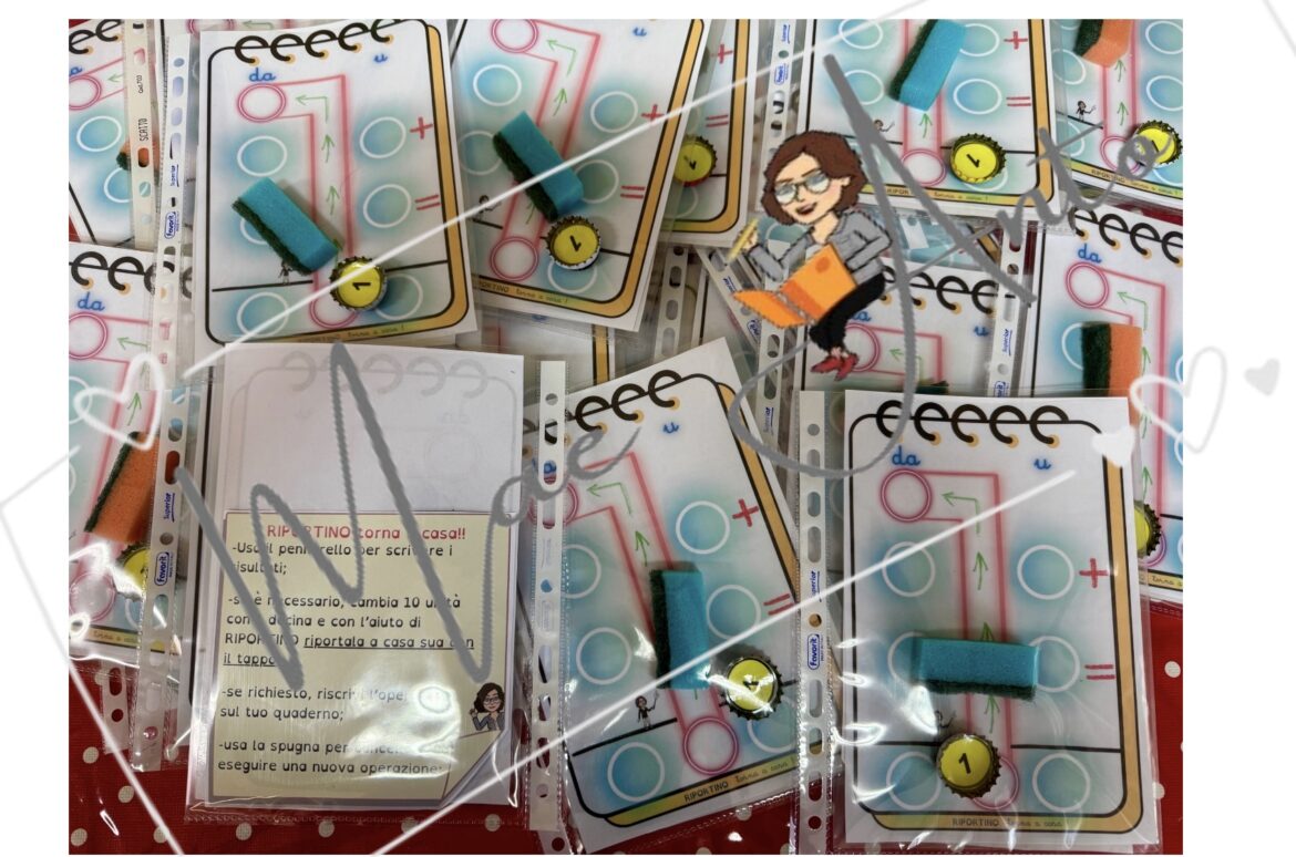 Questo materiale è ideale per comprendere in modo tangibile nella classe seconda primaria le addizioni e le sottrazioni in colonna con il cambio. RIPORTINO, nell’addizione, è un tappo riciclato che diventa la decina che deve tornare a casa sua perchè nella colonna delle unità non c’è più posto. I bambini muovendosi con il tappo, scrivendo con un pennarello e cancellando con una spugnetta o un po’ di carta imparano in modo concreto e giocoso il calcolo in colonna con il riporto ed anche con il prestito grazie a PRESTITONE.