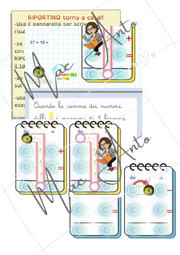 Questo materiale è ideale per comprendere in modo tangibile nella classe seconda primaria le addizioni e le sottrazioni in colonna con il cambio. RIPORTINO, nell’addizione, è un tappo riciclato che diventa la decina che deve tornare a casa sua perchè nella colonna delle unità non c’è più posto. I bambini muovendosi con il tappo, scrivendo con un pennarello e cancellando con una spugnetta o un po’ di carta imparano in modo concreto e giocoso il calcolo in colonna con il riporto ed anche con il prestito grazie a PRESTITONE.