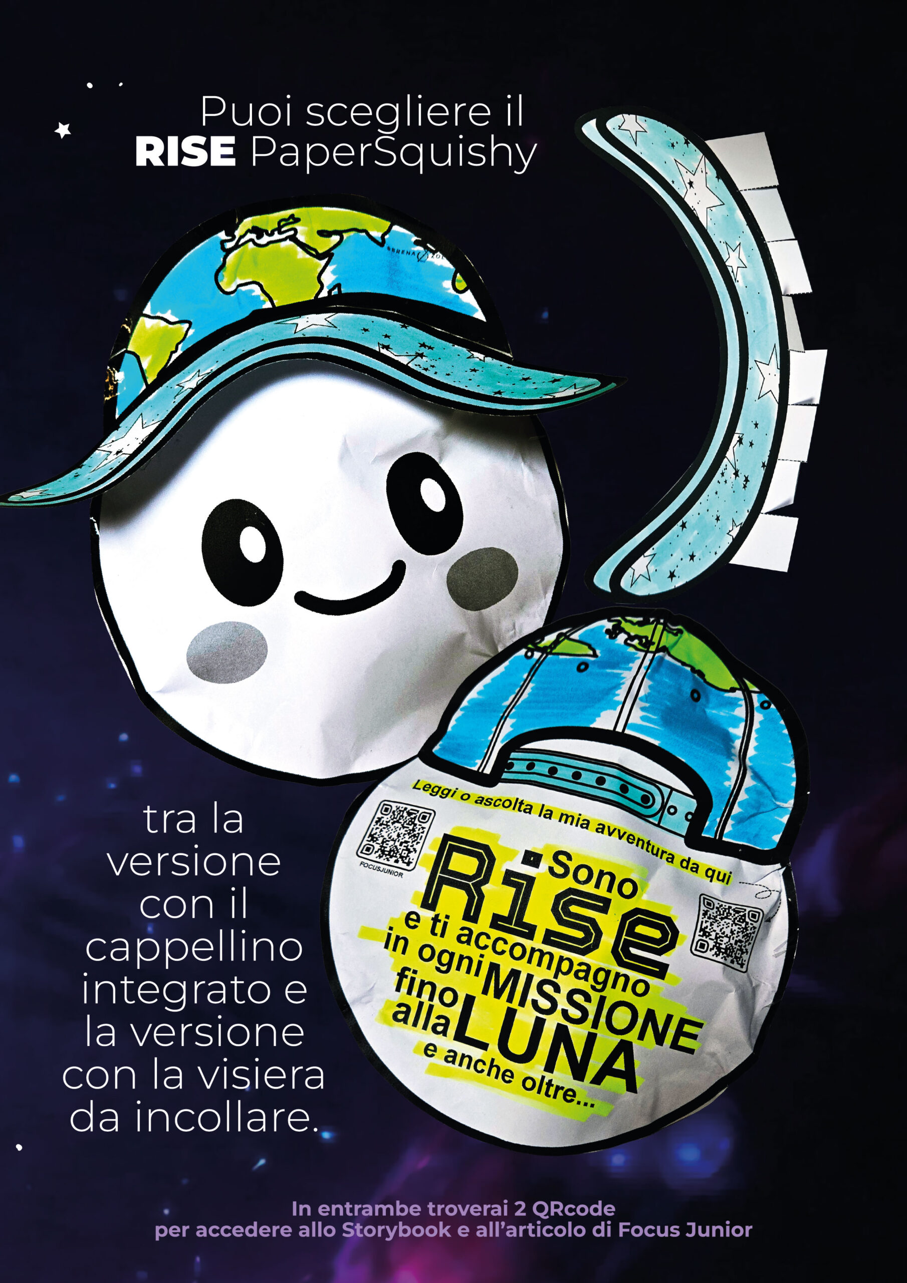 Dopo aver vissuto il viaggio con le parole, è il momento di dare forma ai sogni! Ho progettato il kit per creare il Rise PaperSquishy. Costruire Rise non è solo un’attività di motricità fine, ma un modo per dare ai bambini un compagno di banco che “ha visto la Luna”. Troverai una versione più semplice (con cappellino integrato) e una più avanzata (con visiera 3D). Sul retro di Rise sono presenti dei QR Code che permettono ai bambini di riascoltare la storia o approfondire con un articolo di Focus Junior ogni volta che vogliono.