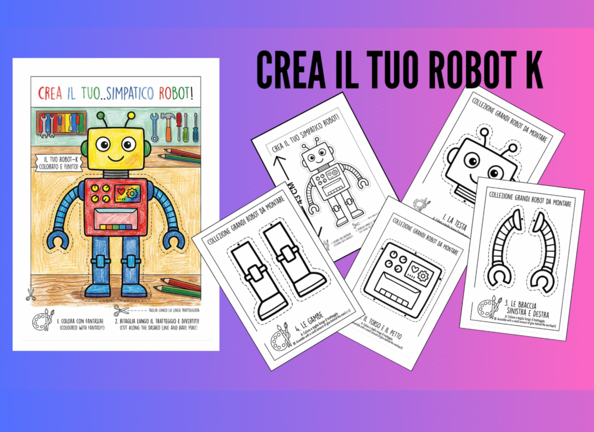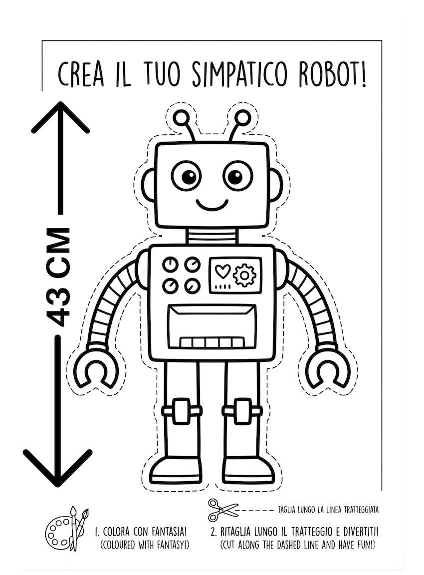 Oggi non siamo solo in un’aula o in una stanza, ma siamo diventati i Capo-Ingegneri di un’officina spaziale! Avete mai sognato di costruire un amico su misura? Con la nostra collezione di “Grandi Personaggi da Montare”, il sogno diventa realtà. Stampa e Incolla: Prima di tutto, la scheda completa deve essere stampata. Per un risultato eccellente e duraturo, si consiglia di incollare l’intera pagina su un foglio di cartoncino rigido (come il retro di un album da disegno o cartone di recupero sottile) o stampare direttamente su un foglio più resistente. Colora con Fantasia: Prima di tagliare, è il momento di liberare la creatività! Il robot è in bianco e nero proprio per essere colorato. Usa pennarelli, pastelli, tempere o persino adesivi per personalizzare la testa, il corpo (con il suo cuore-meccanico e i bottoni!) e gli arti flessibili. Ritaglia: Una volta che il robot è asciutto e colorato, un adulto può aiutare a ritagliare lungo le linee tratteggiate. I pezzi sono grandi e semplici, perfetti per sviluppare la coordinazione . Assembla: Usa della colla stick o della colla vinilica per unire le braccia e le gambe al corpo centrale nei punti indicati. In pochi minuti, Robot-K sarà pronto per nuove avventure spaziali! Questo progetto non è solo un lavoretto, ma un modo per insegnare il riciclo (se si usa cartone di recupero), la pianificazione e la gioia di creare qualcosa con le proprie mani.