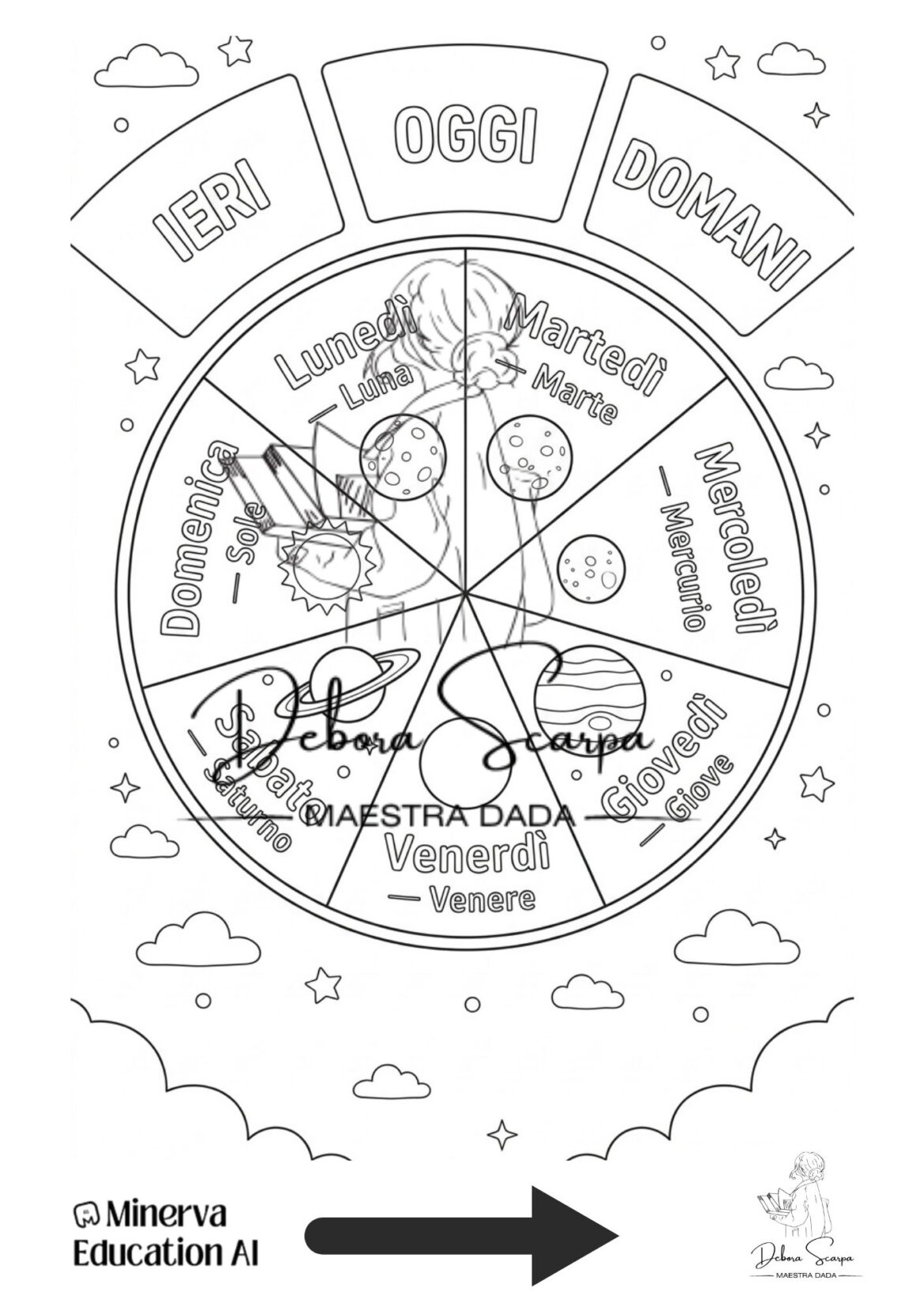 Ruota dei giorni della settimana in bianco e nero e a colori, con riportati i nomi dei pianeti, per spiegare ai bambini da dove derivano i nomi dei giorni della settimana, con indicatori temporali ieri, oggi, domani al fine di aiutarli a comprendere la sequenzialità e ciclicità della settimana.