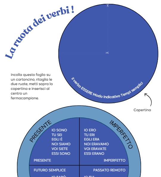 Una ruota dei verbi da colorare, ritagliare e utilizzare per lo studio del verbo essere modo indicativo, adatto per alunni di terza primaria e apprendenti italiano L2.