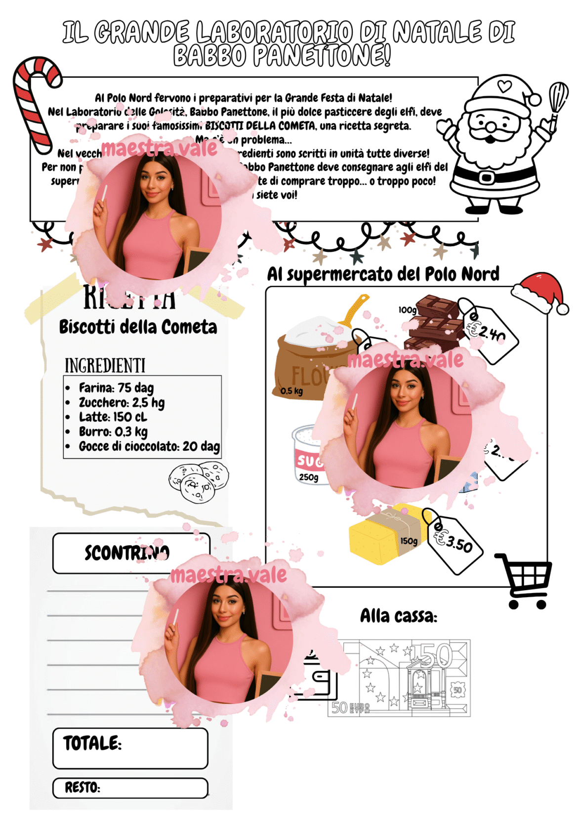 Un’attività completa, narrativa e coinvolgente per allenare equivalenze, calcolo con gli euro, acquisto delle quantità e resto. Il protagonista è il simpatico Babbo Panettone, il più dolce pasticcere degli elfi che deve preparare deve preparare i suoi famosissimi Biscotti della Cometa. C’è un problema però: ha ha scritto la ricetta con unità di misura sbagliate: i bambini dovranno aiutarlo convertendo le misure in modo tale che possa poi acquistare i prodotti al supermercato del Polo Nord e infine comporre lo scontrino con il resto.