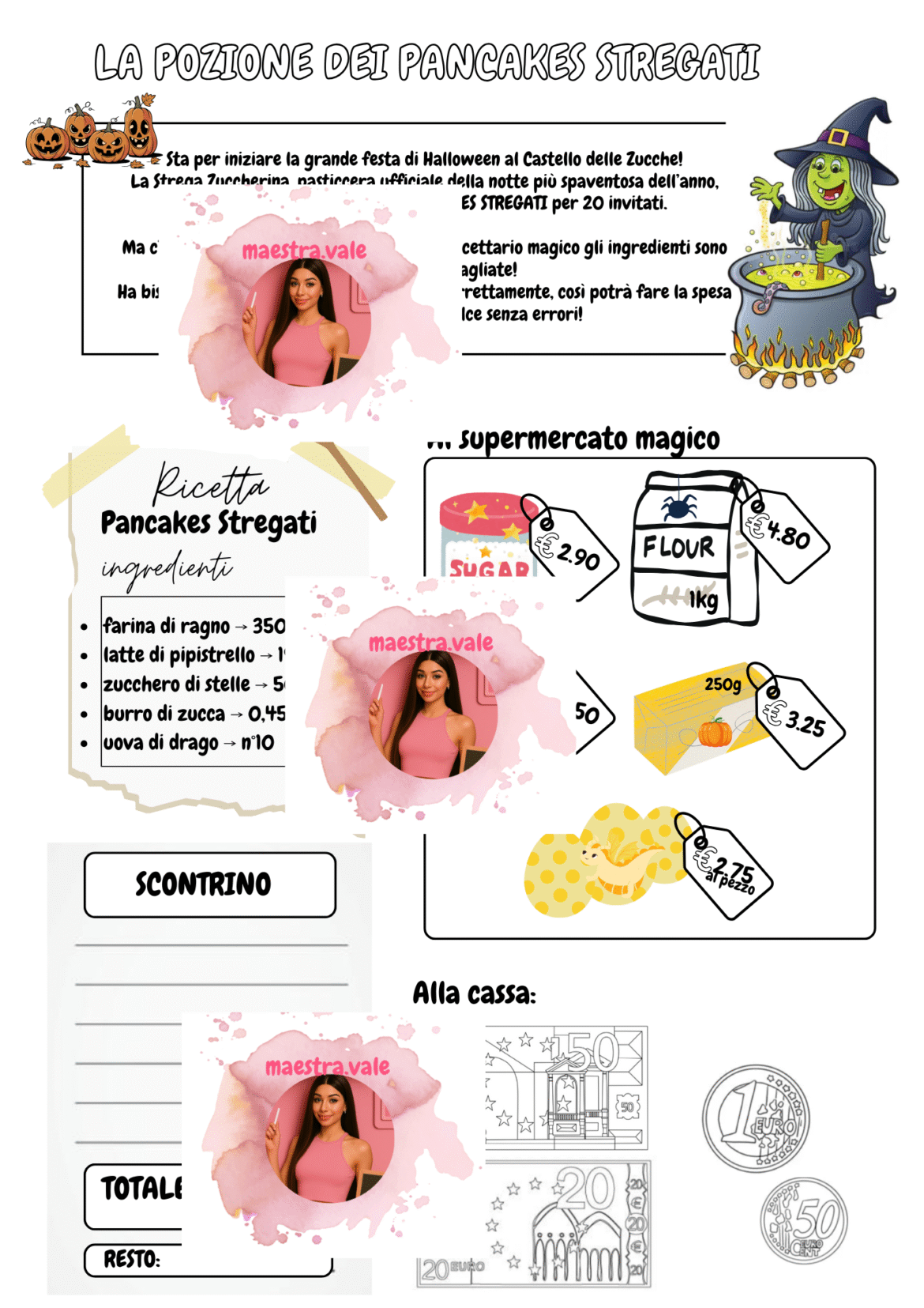 Un’attività completa, narrativa e coinvolgente per allenare equivalenze, calcolo con gli euro, acquisto delle quantità e resto. La protagonista è una simpatica Strega Zuccherina che deve preparare dei pancake stregati per la festa di Halloween, ma ha scritto la ricetta con unità di misura sbagliate: i bambini dovranno aiutarla convertendo le misure in modo tale che possa poi acquistare i prodotti al supermercato magico e infine comporre lo scontrino con il resto.