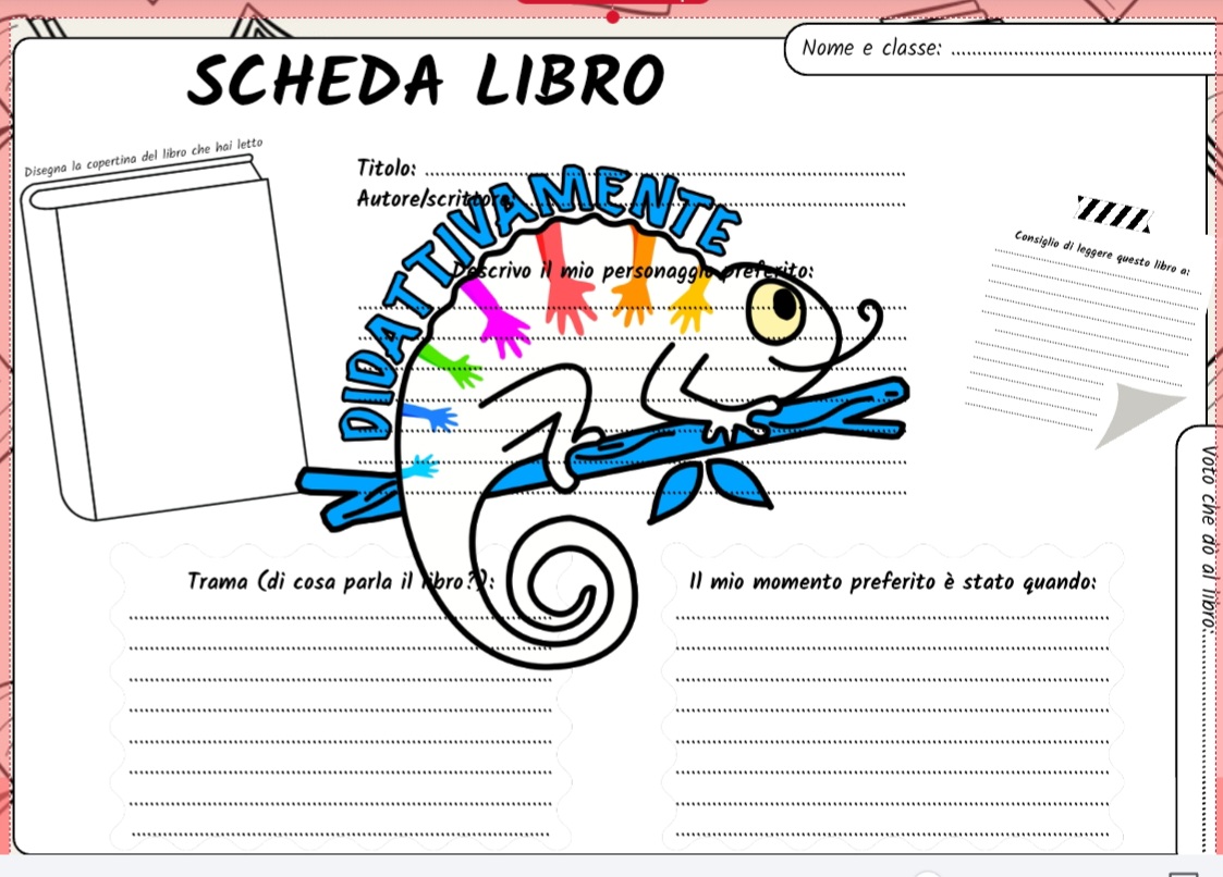 📚La scheda richiede ai bambini di scrivere alcune informazioni su un libro letto come la trama, il personaggio preferito, il titolo e l’autore, inoltre dà la possibilità ai bambini di dare un voto al libro letto, di scrivere le persone a cui consiglierebbe di leggerlo e di disegnarne la copertina.