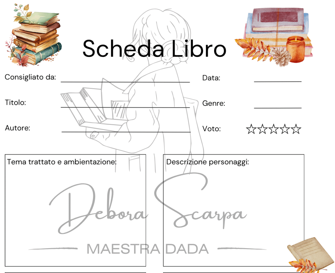 Una scheda per riassumere gli aspetti salienti di ogni libro letto, che assegna anche una valutazione di gradimento del libro, da chi è stato consigliato, perfetta ai fini della comprensione del testo.