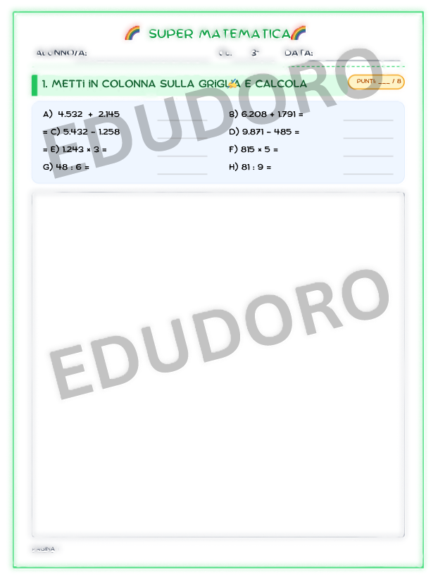 La scheda integra i due pilastri della matematica: il calcolo scritto e il problem solving. Per facilitare il passaggio dal concreto all’astratto, la risoluzione dei problemi è supportata dai Bar Models (Metodo Singapore), utilizzati come facilitatori visivi e strategici. Le operazioni dispongono di un ampio spazio a quadretti (non visibili in anteprima) dedicato per l’esecuzione in colonna; in particolare, le divisioni proposte sono “esatte”, introdotte didatticamente come operazione inversa della moltiplicazione.