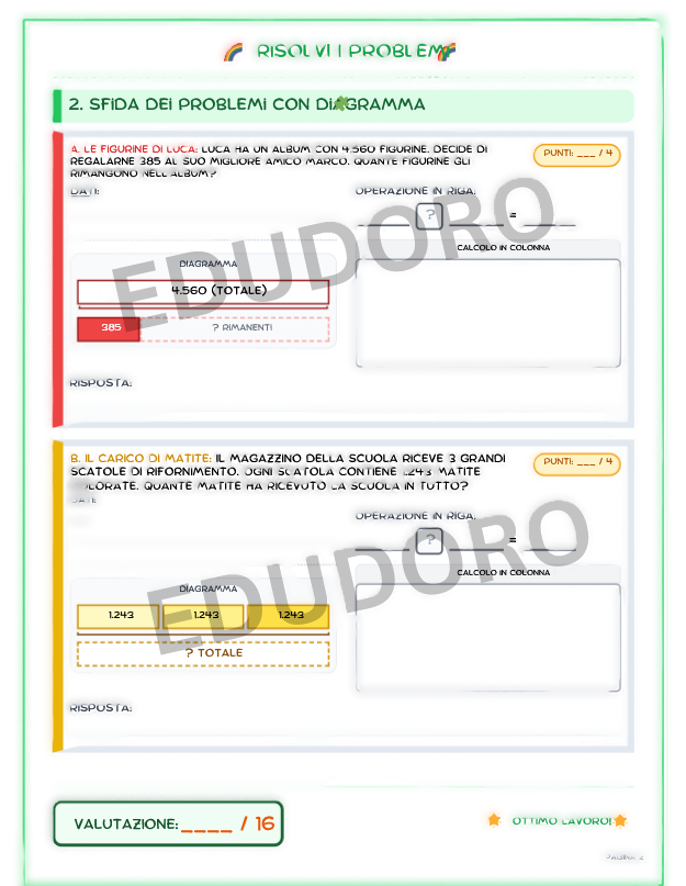 La scheda integra i due pilastri della matematica: il calcolo scritto e il problem solving. Per facilitare il passaggio dal concreto all’astratto, la risoluzione dei problemi è supportata dai Bar Models (Metodo Singapore), utilizzati come facilitatori visivi e strategici. Le operazioni dispongono di un ampio spazio a quadretti (non visibili in anteprima) dedicato per l’esecuzione in colonna; in particolare, le divisioni proposte sono “esatte”, introdotte didatticamente come operazione inversa della moltiplicazione.