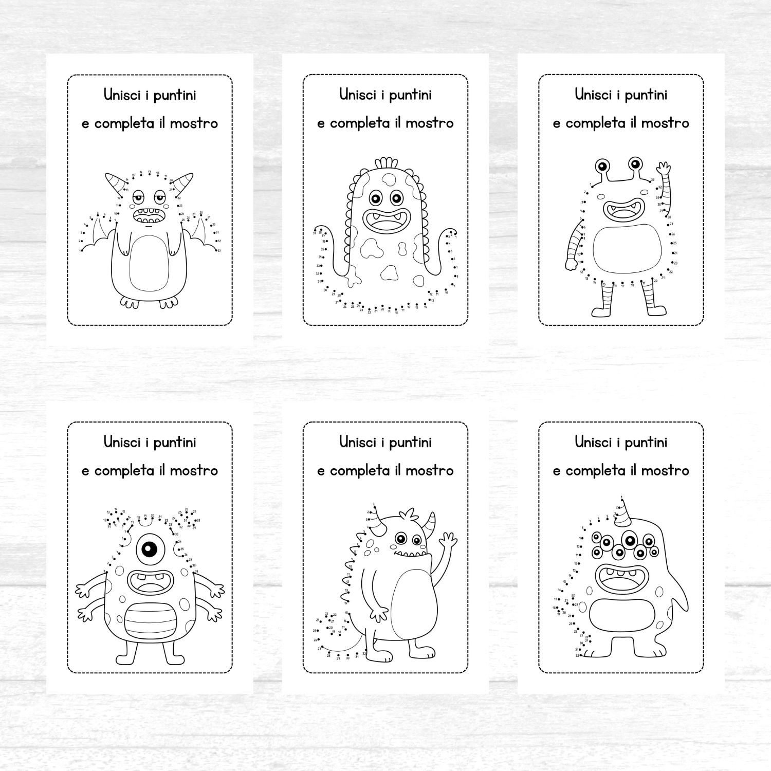 - 6 schede con puntini da unire per imparare l’ordine numerico;