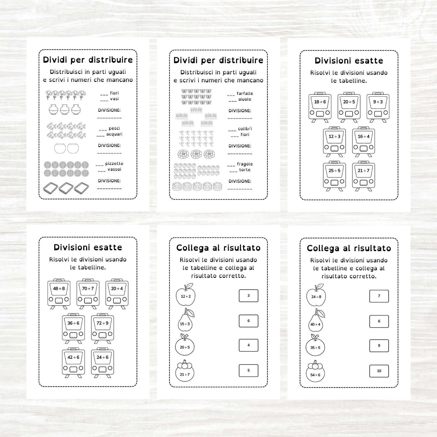 Il PDF include esercizi di ripasso delle divisioni esatte (basandosi sulle tabelline per ottenere il risultato) e semplici problemi illustrati in cui dividere gli elementi per distribuirli equamente.
