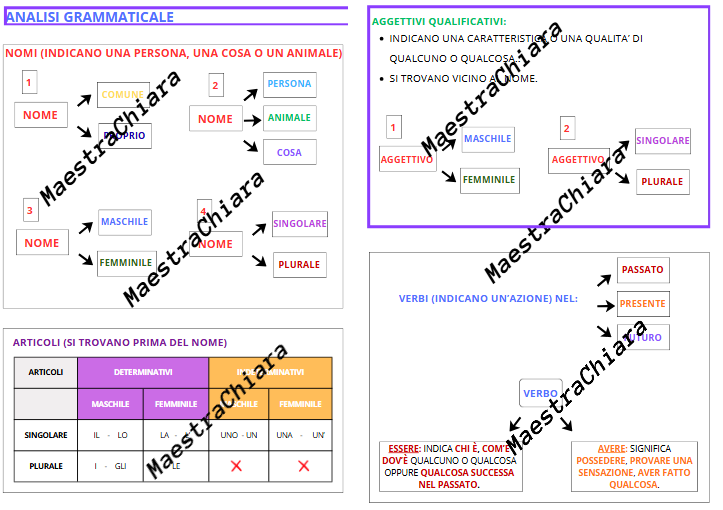 Uno schema colorato e chiaro come supporto per le prima analisi grammaticale in classe seconda o come strumento compensativi per gli alunni con difficoltà adatto dalla classe seconda in poi. Da stampare e plastificare e da tenere sempre con sè per semplificare l’analisi grammaticale!