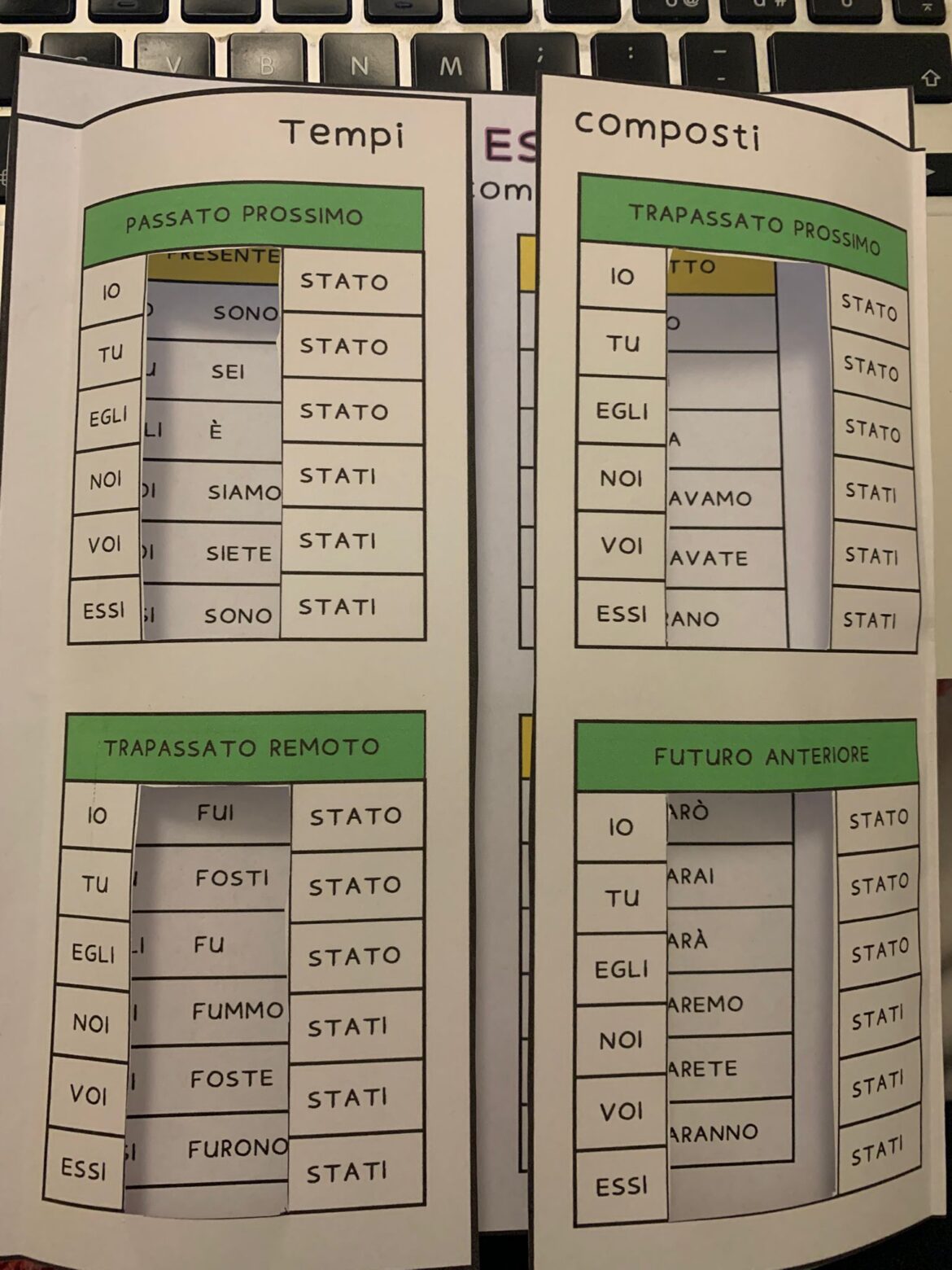 Basta ritagliare lungo le linee ed eliminare il rettangolo bianco della scheda dei tempi composti usando delle forbicine o un punteruolo (o un taglierino se fatto da un adulto), piegare i bordi della scheda “tempi composti” e incollarli sulla scheda “tempi semplici”.