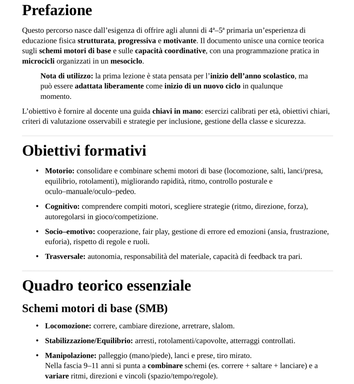 Percorso operativo di quattro settimane per la scuola primaria, pensato, eseguito e calibrato per le classi 4ª–5ª della Scuola Primaria. La struttura propone una progressione chiara: riscaldamento standardizzato, attività centrali a complessità crescente e chiusura in forma competitiva guidata. La cornice teorico–pratica sintetizza gli elementi essenziali su schemi motori di base e capacità coordinative; i format sono uniformi e immediatamente trasferibili in palestra.