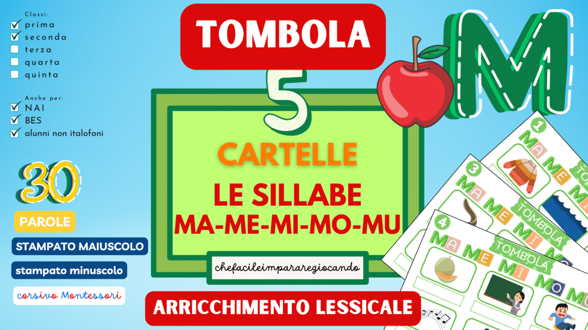 ✅ 5 cartelle illustrate con 6 immagini ciascuna, tutte legate a parole che iniziano con ma, me, mi, mo, mu.