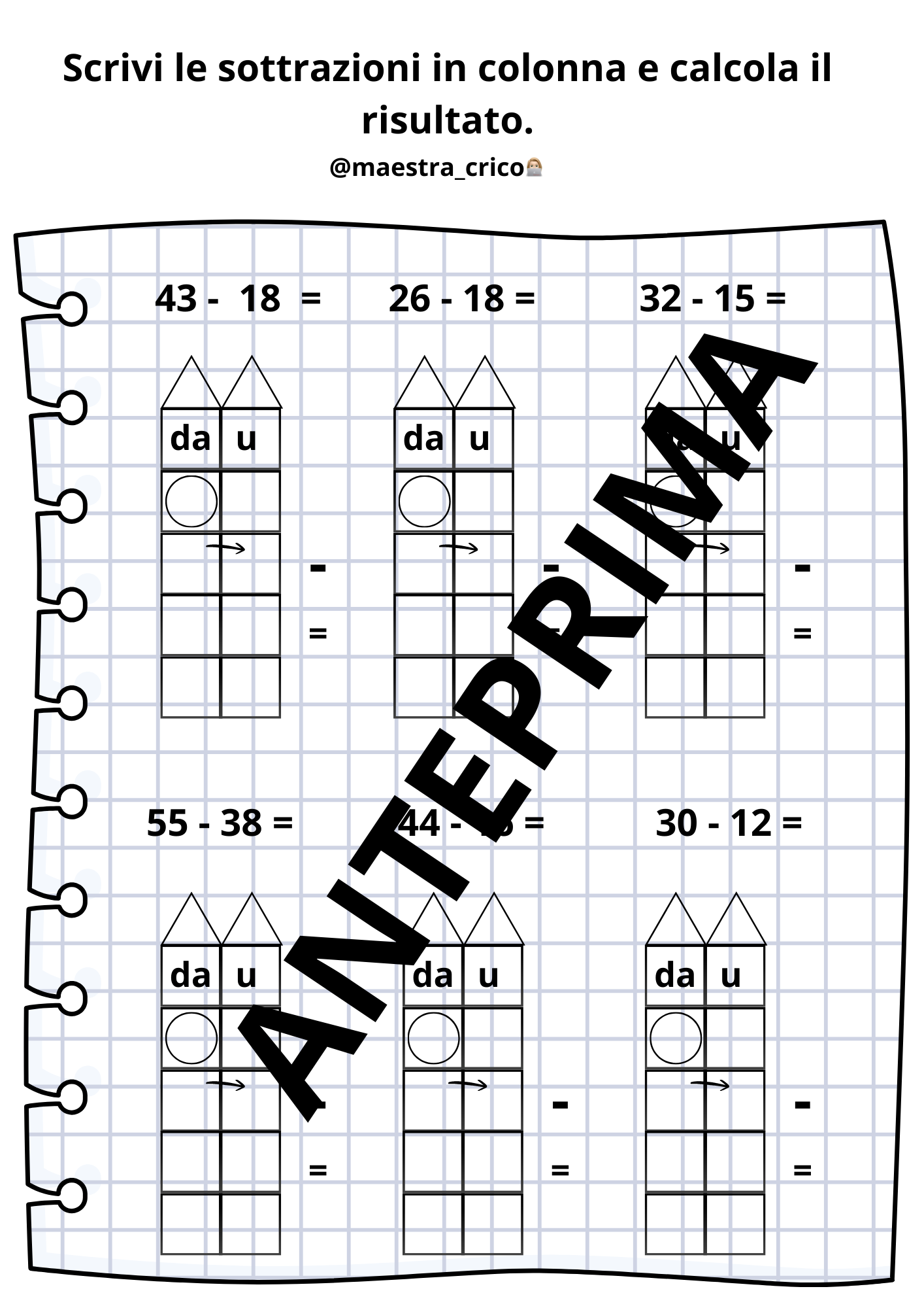 - Numerose schede operative con ben 18 sottrazioni da risolvere, ideali per esercitarsi e consolidare l’apprendimento.