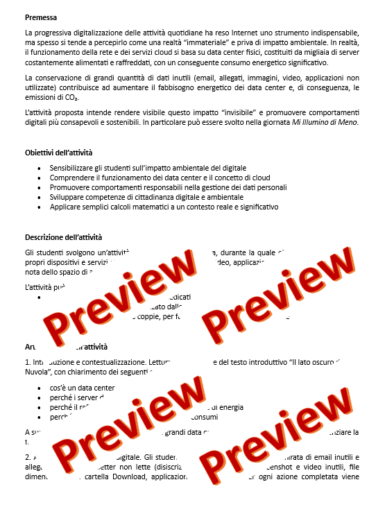 Include materiali pronti all’uso: guida docente, testo introduttivo per la classe, scheda operativa per la pulizia digitale, modello di calcolo del risparmio energetico, un’attività di riflessione finale e segnalibro educativo stampabile con tre semplici regole di comportamento digitale sostenibile.