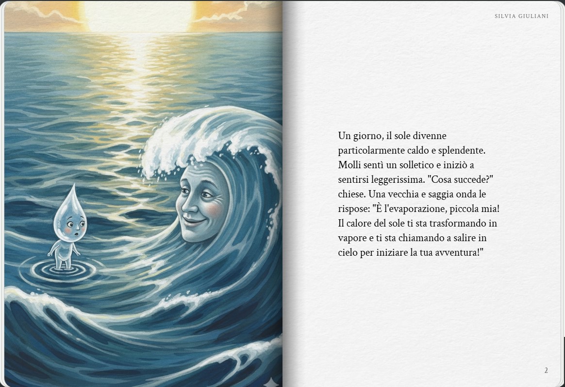 Molli, una piccola molecola di acqua, ci accompagnerà alla scoperta di tutto quello che la riguarda (le proprietà dell’acqua, il ciclo dell’acqua, i cambiamenti di stato…). Storybook in PDF. Creazione degli storybook con Gemini.