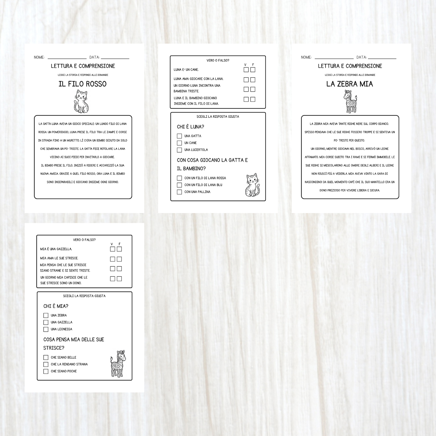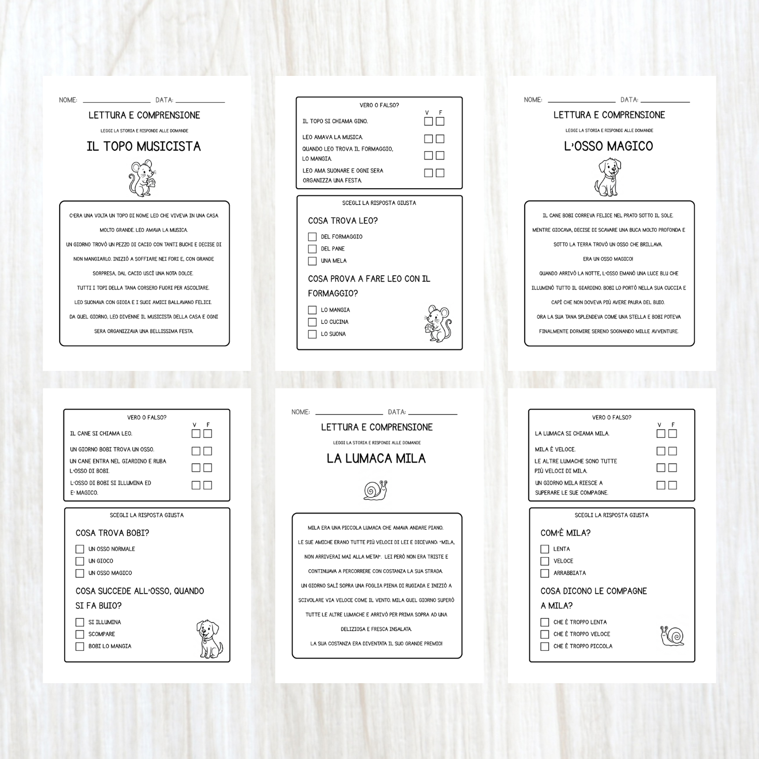 Questo PDF racchiude 5 storie in stampatello maiuscolo con domande di comprensione a crocette, per bambini della classe prima della scuola primaria.