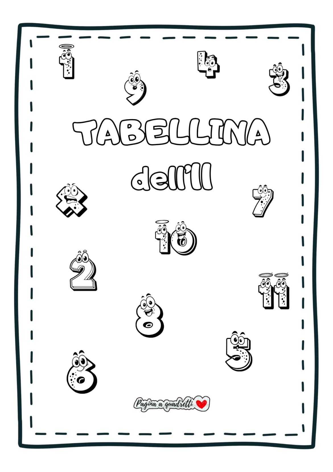Copertina colorabile: Una pagina iniziale accattivante che i bambini e le bambine possono personalizzare, introducendo la tabellina dell’11 con numeri simpatici.
