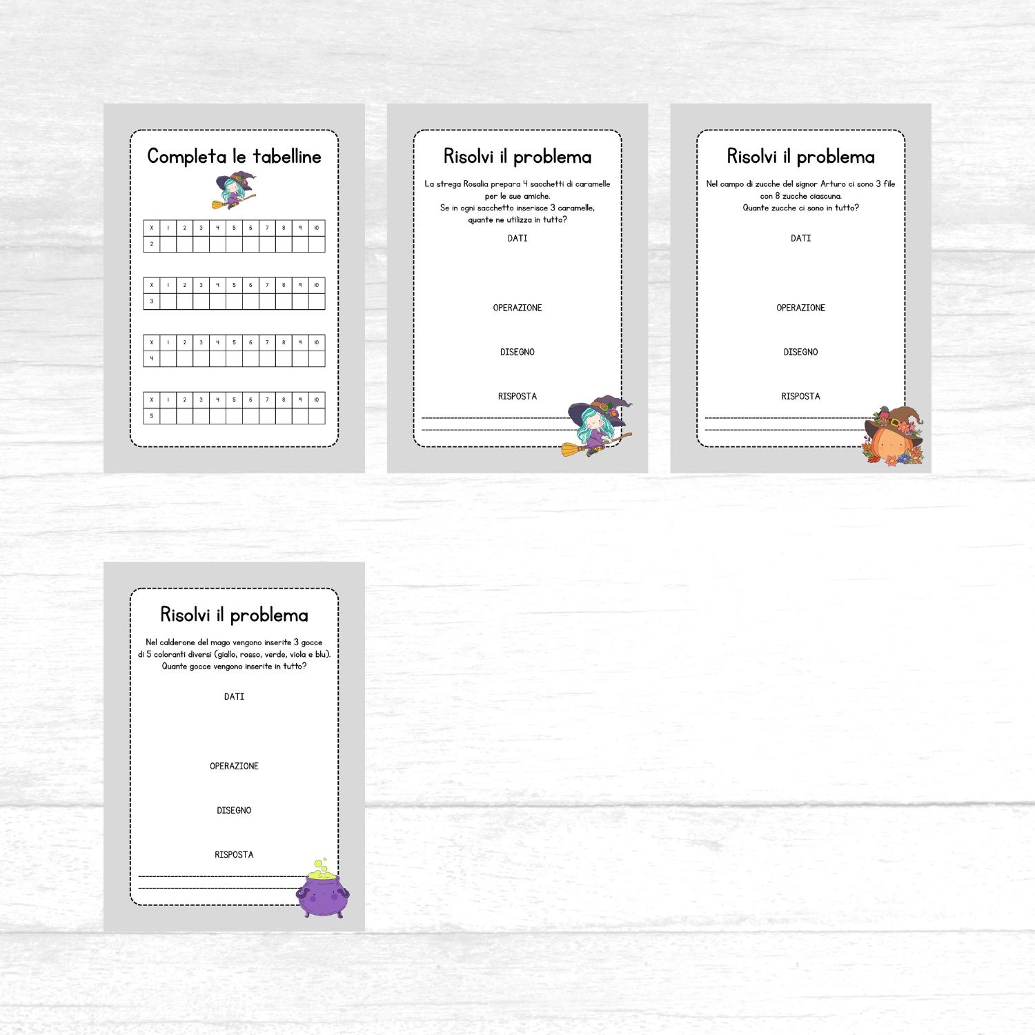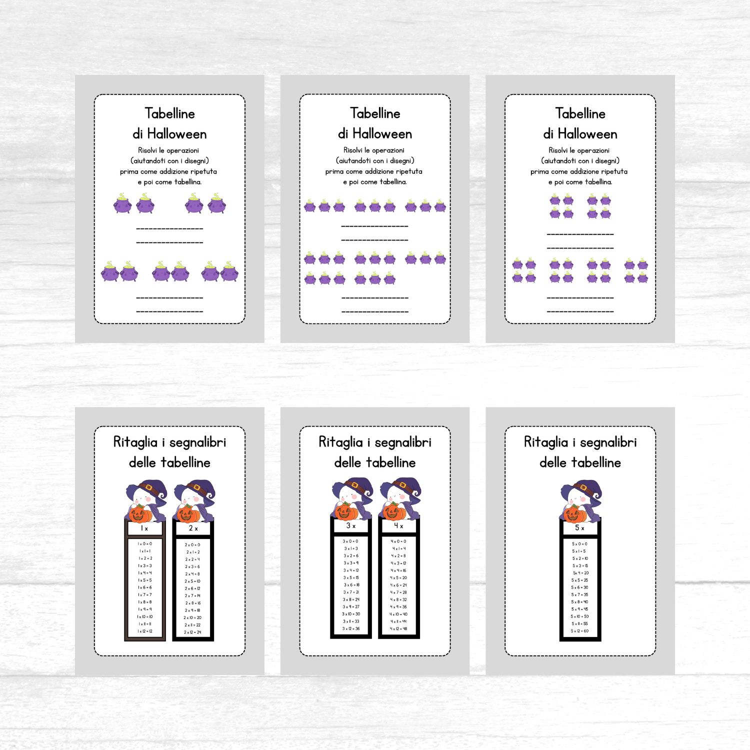 Questo pack di schede didattiche sulle tabelline fino al 5 è un PDF da stampare a tema Halloween.