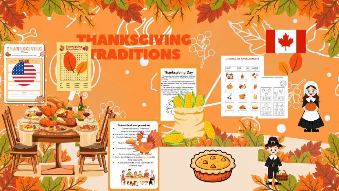 Scopri un pacchetto di attività didattiche coinvolgenti per celebrare il Ringraziamento in classe! Questo materiale è perfetto per aiutare i tuoi alunni e le tue alunne a esplorare la cultura del Ringraziamento, imparare nuovo vocabolario inglese e rafforzare importanti abilità di base in modo divertente e interattivo.