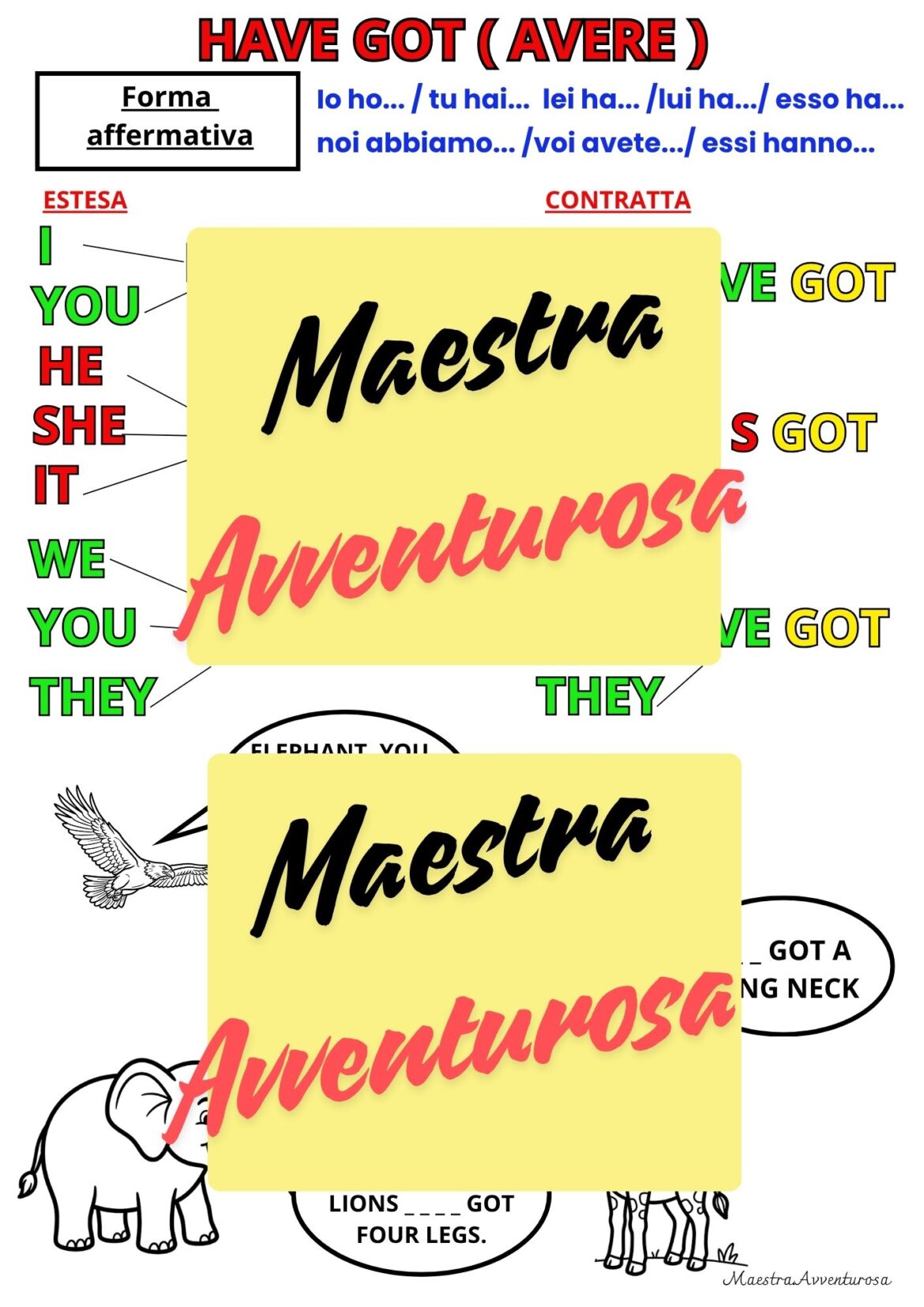 Vuoi rendere l’apprendimento del verbo “to have got” un’esperienza chiara e divertente per i tuoi bambini? Questo materiale didattico è pensato proprio per te! Aiuta i tuoi studenti, o tuo figlio, a padroneggiare le forme affermativa, negativa e interrogativa di “have got” in inglese, con un approccio visivo e coinvolgente.