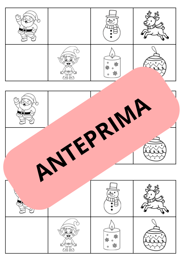 Christmas Bingo con 7 set da 3 cartelle ciascuno con immagini in bianco e nero lessico di Natale (Santa Claus, Snowman, Reindeer, Elf, Christmas ball, Star, Heart, Candle, Christmas Tree).