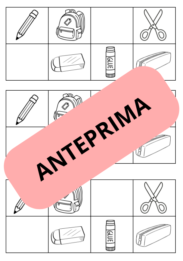 7 set da 3 cartelle ciascuno x Bingo con immagini in bianco e nero lessico Oggetti scolastici (pencil, school bag, scissors, glue stick, pen, pencil case, rubber, felt tip pen, book, sharpener).