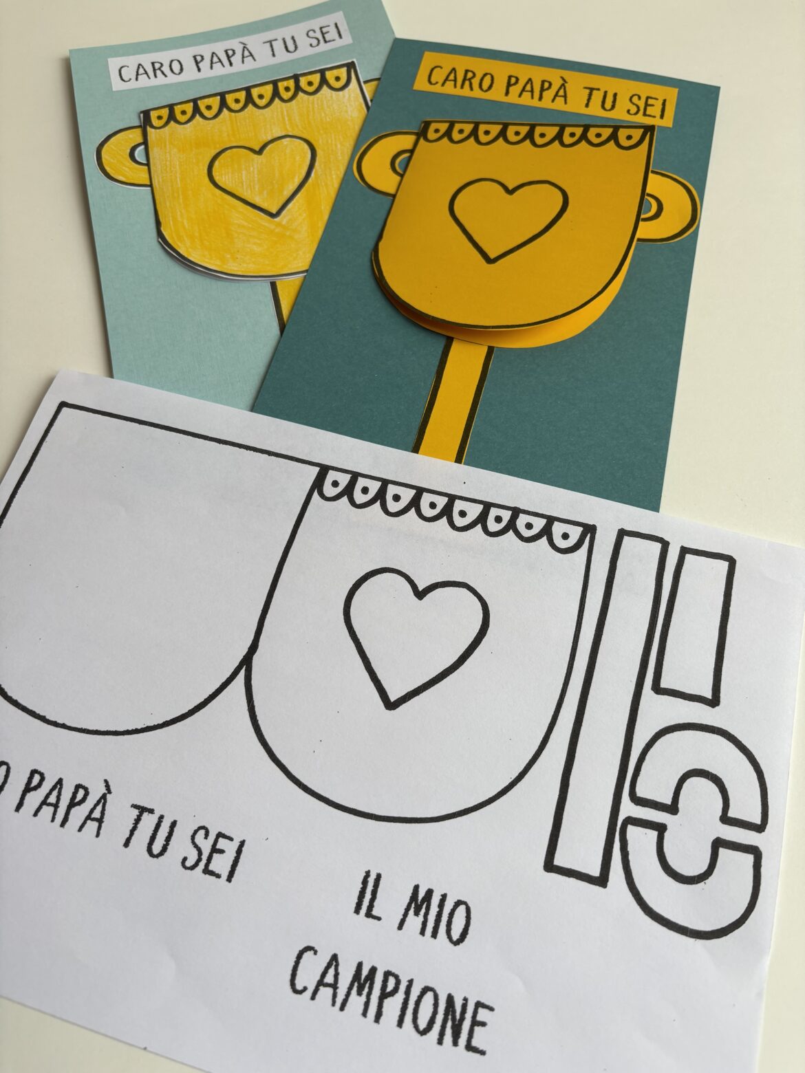 Un biglietto a forma di coppa per la festa del papà da colorare, ritagliare ed incollare su un cartoncino rigido.