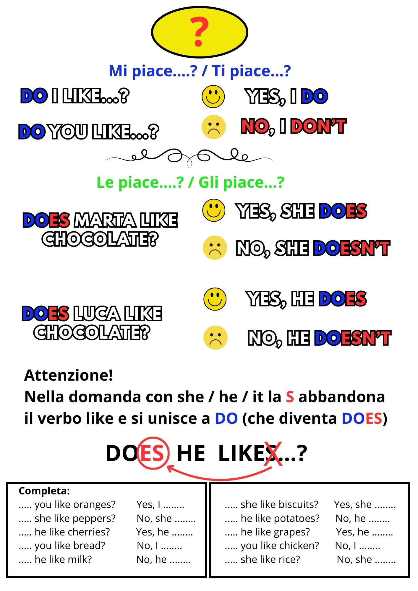 - Formare frasi affermative, negative e interrogative con “like” in tutte le persone grammaticali.