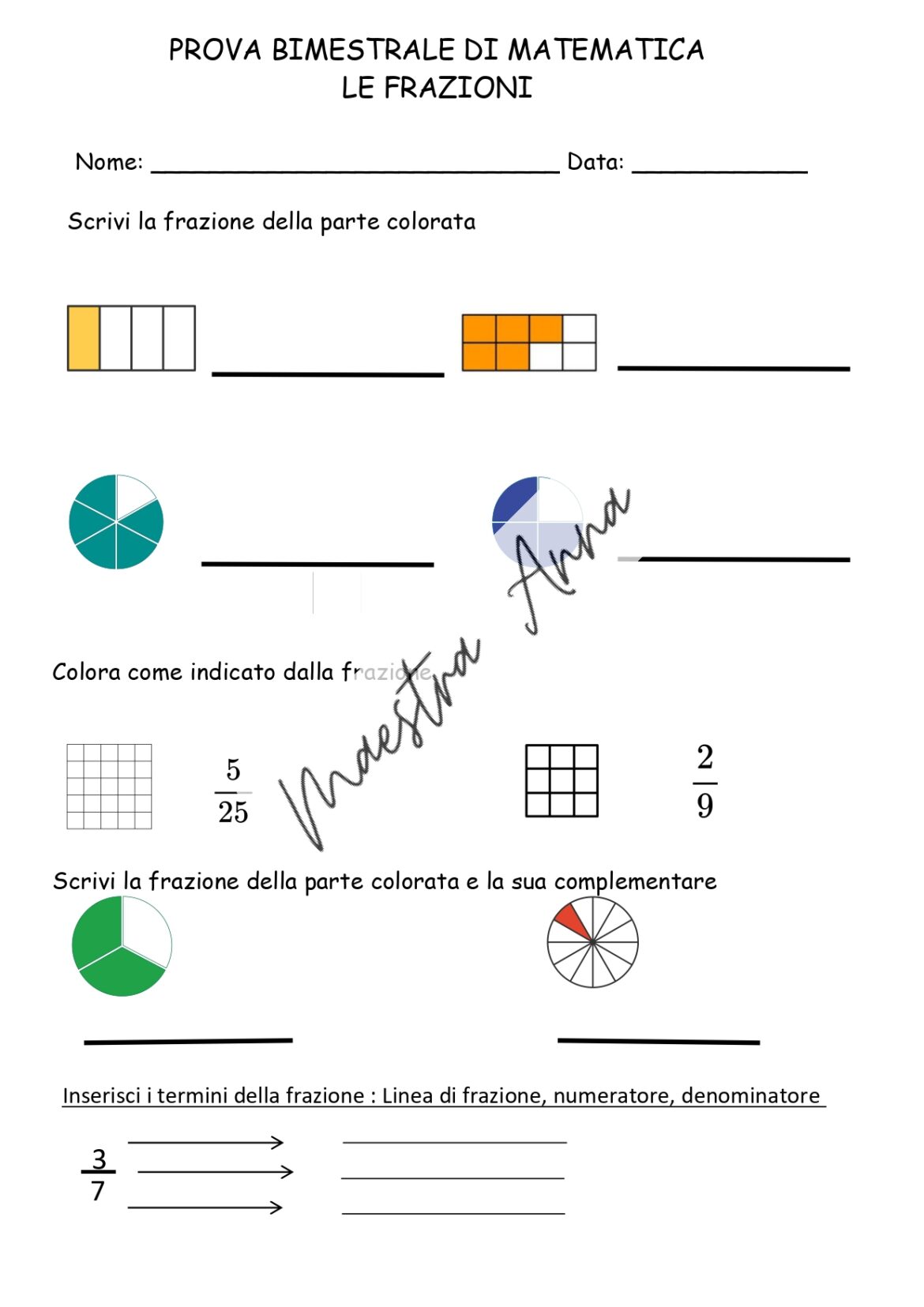 Prova scritta completa sulle frazioni, ideale per la verifica bimestrale nella scuola primaria.